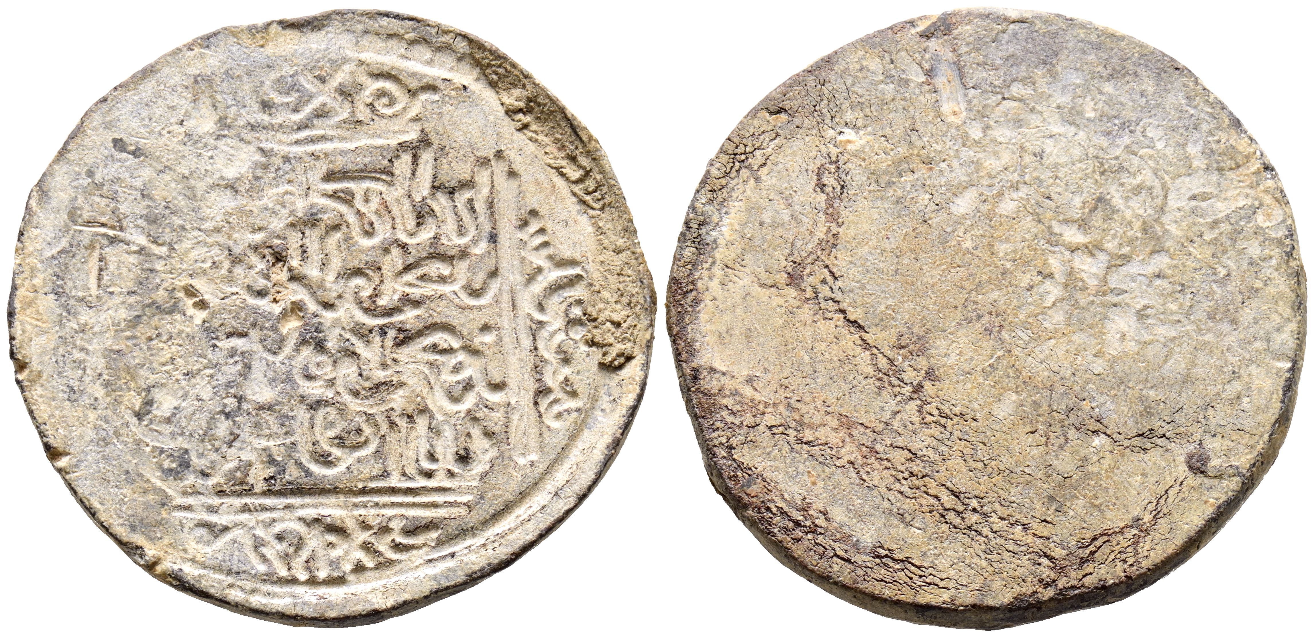 "REINO DE GRANADA". Sello. (Pb. 15,39g/32x31x2,5mm). Posiblemente Siglo X-XV. Placa de plomo monetiforme con escritura nasji en huecograbado. Anv: Simulación en negativo del diseño de una dobla nazarí. Rev: Anepígrafo, con marcas de un antiguo sistema de sujeción. Según nuestras fuentes, es muy probable que la presente pieza sea un cospel de amuleto de plomo auténtico, pero liso, de época. Sobre él han marcado actualmente la impronta de una reproducción. MBC.