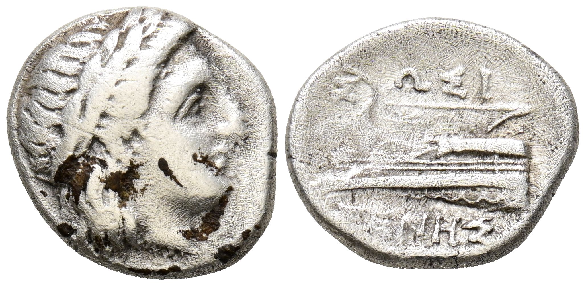 BITINIA, Kios. Hemidracma. (Ar. 2,37g/15mm). 345-315 a.C. Miletos. (SNG Copenhagen 370). Anv: Cabeza laureada de Apolo a derecha. Rev: Proa a izquierda, alrededor leyenda griega. MBC-.