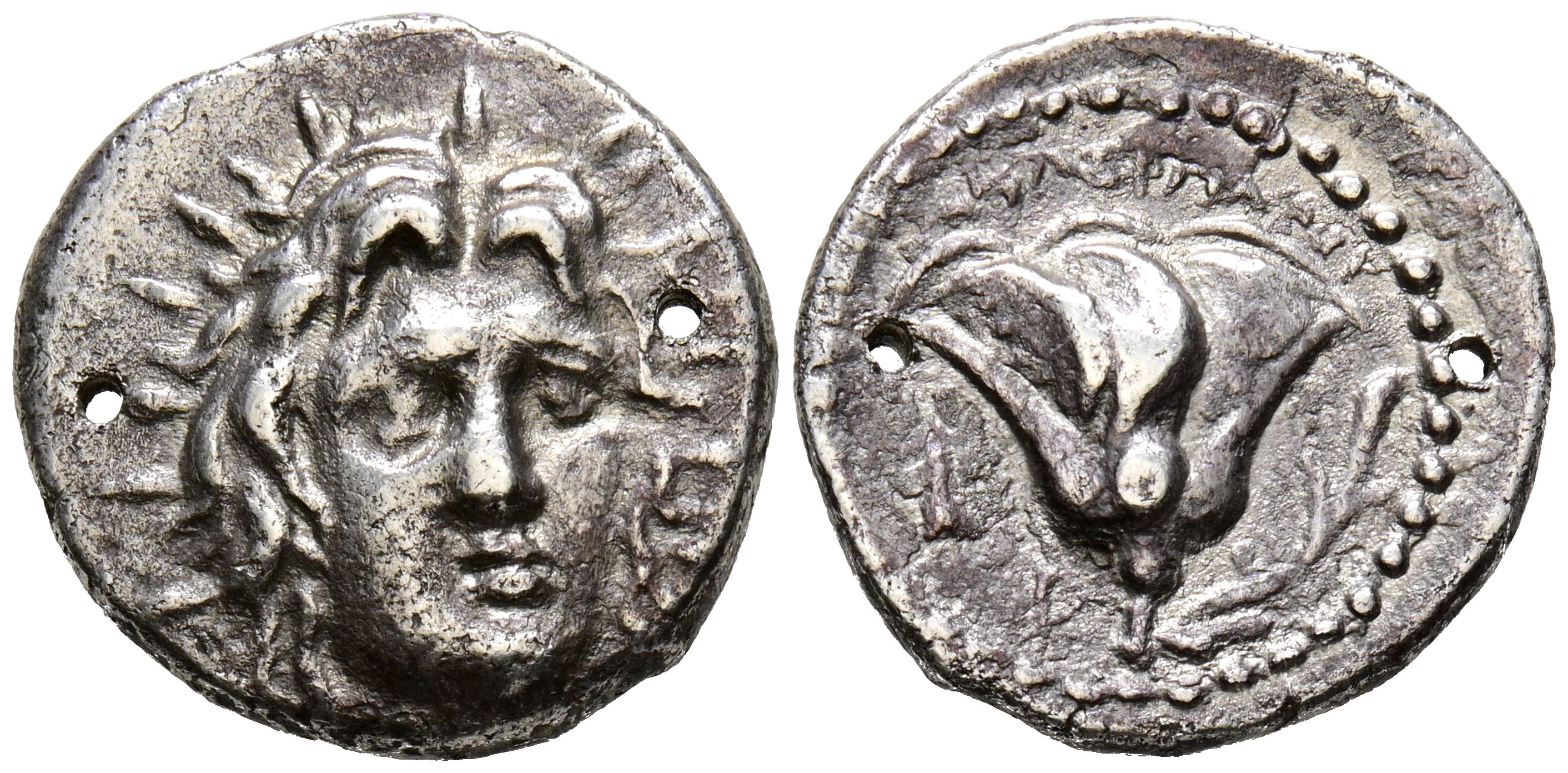 ISLAS DE CARIA, Rodes. Didracma. (Ar. 6,29g/20mm). 250-229 a.C. (HGC 6, 1439; SNG Keckman 537-8). Anv: Cabeza radiada de Helios mirando a derecha. Rev: Rosa con tallo, encima leyenda griega, a la izquierda Atenas estante a izquierda. MBC. Dos perforaciones.