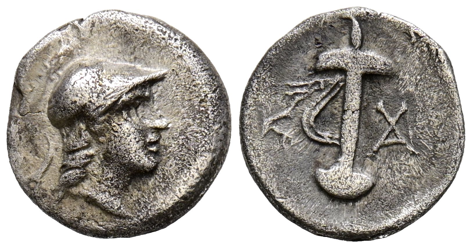 CARIA, Kaunos. Hemidracma. (Ar. 1,10g/11mm). 166-100 a.C. (SNG Keckman 83). Anv: Cabeza de Atenas con casco a derecha. Rev: Vaina de espada entre monogramas griegos. MBC-.