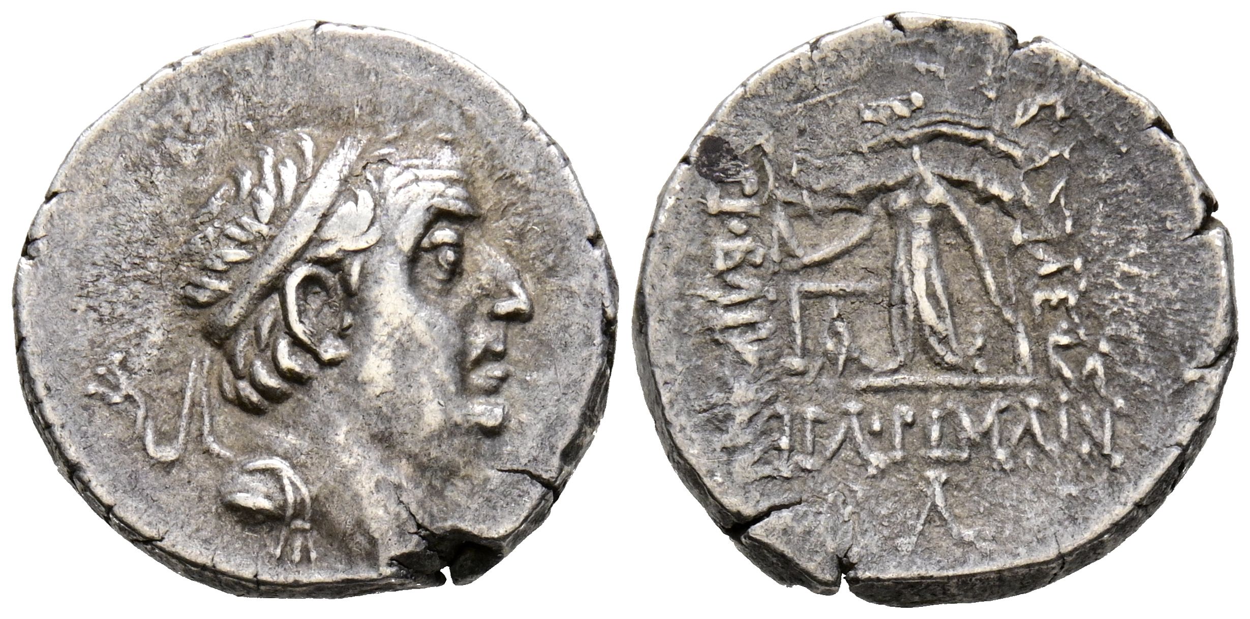 REYES DE CAPADOCIA, Ariobarzanes I Philoromaios. Dracma. (Ar. 4,12g/17mm). 95-63 a.C. Eusebia. (HGC 7, 846). Anv: Cabeza diademada a derecha. Rev: Atenas estante a izquierda portando Nike, lanza y escudo, delante monograma, alrededor leyenda griega. MBC.