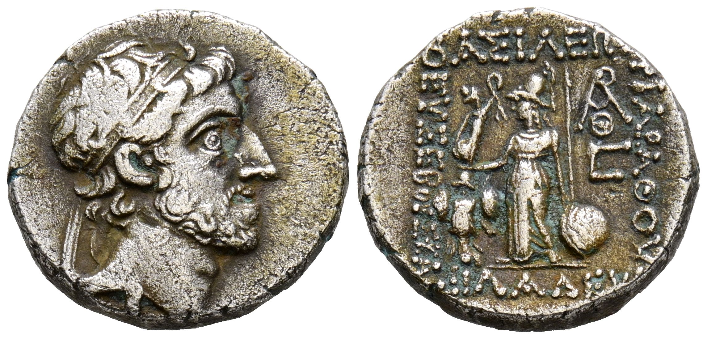 REYES DE CAPADOCIA, Ariarathes X Eusebes Philadelphos. Dracma. (Ar. 3,69g/16mm). 42-36 a.C. (HGC 7, 855). Anv: Cabeza diademada a derecha. Rev: Atenas estante a izquierda portando Victoria con corona de laurel, detrás lanzas y escudos, a sus pies trofeo, en campo monogramas griegos, alrededor leyenda griega. MBC.