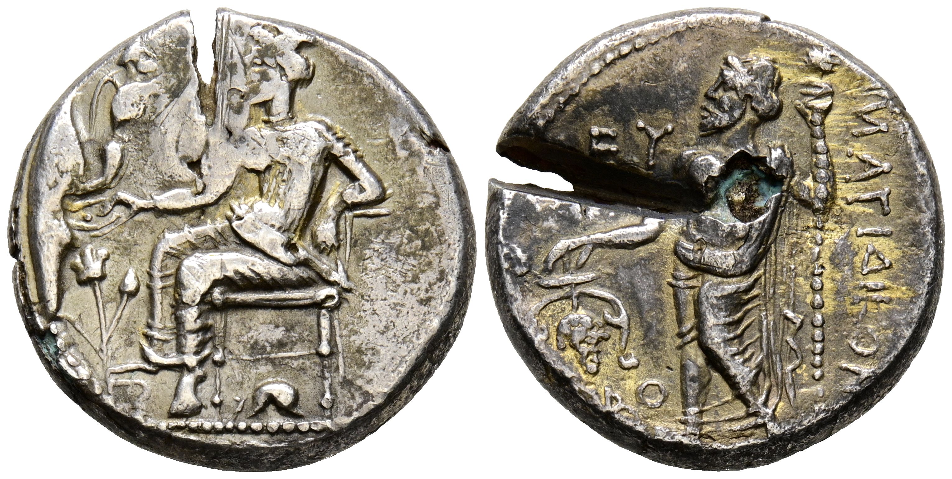 CILICIA, Nagidos. Estátera. (Ar. 8,19g/21mm). 400-385 a.C. (SNG BN 34). Anv: Afrodita sentada a izquierda portando patera, debajo del trono ratón, delante flor y Eros volando a derecha. Rev: Dionysos estante a izquierda portando cetro y racimo de uvas, delante monogramas, detrás leyenda griega. MBC. Fuerte golpe de cizalla.