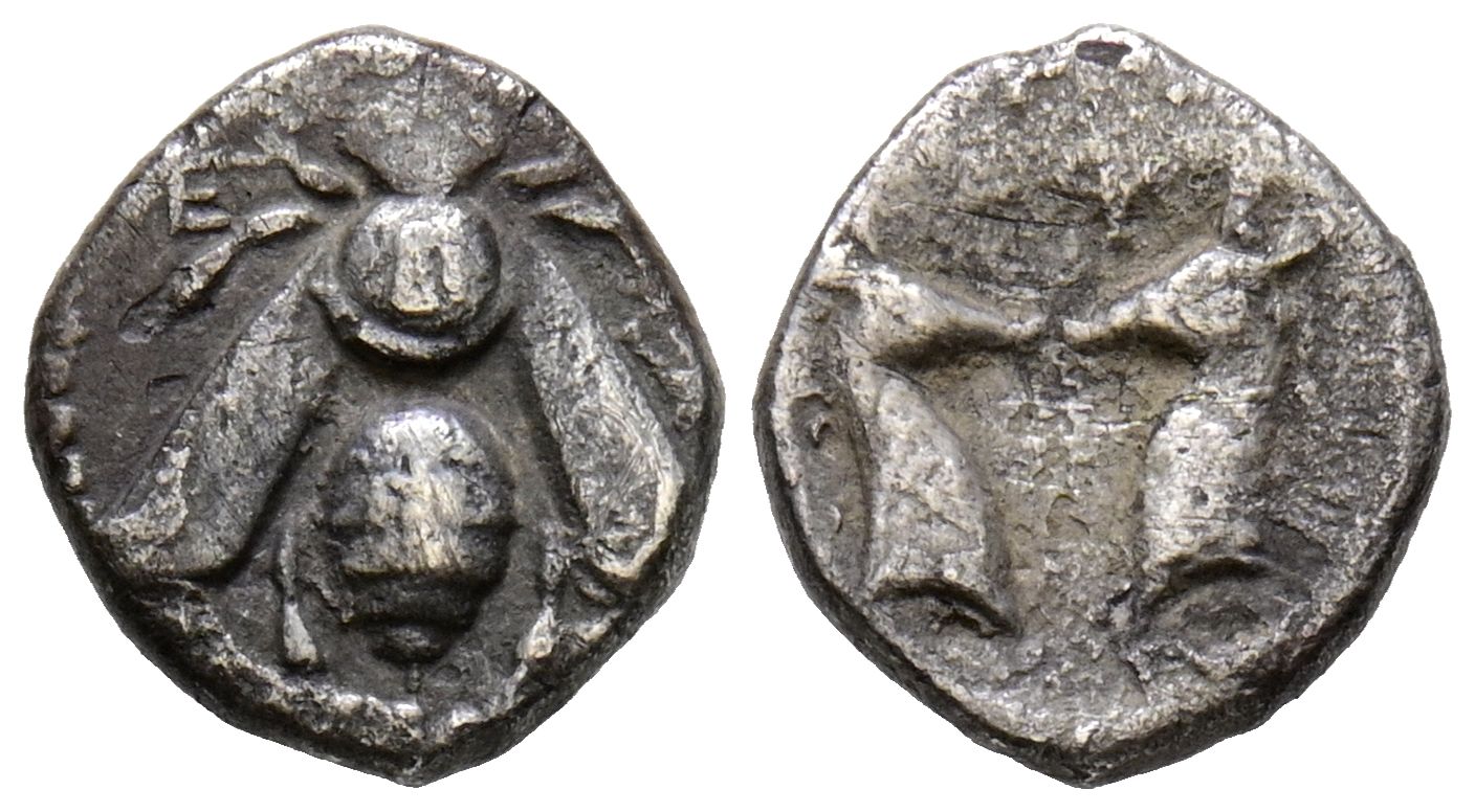 JONIA, Efeso. Dióbolo. (Ar. 0,84g/10mm). 390-325 a.C. (SNG Copenhagen 242). Anv: Abeja vista desde arribe entre dos letras. Rev: Dos cabezas de ciervos enfrentadas, entre ellas letras. MBC-.