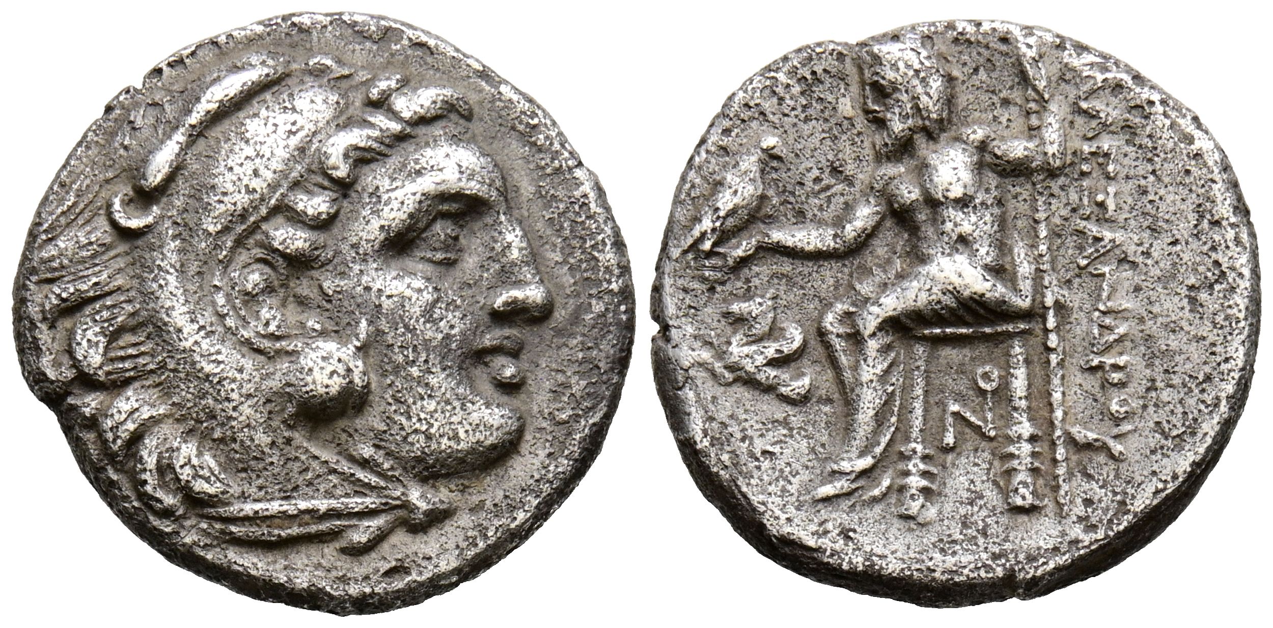 REYES DE MACEDONIA, Alejandro III el Grande. Dracma. (Ar. 4,05g/17mm). 336-323 a.C. Lampsakos. (Price 1382). Anv: Cabeza de Heracles con piel de león a derecha. Rev: Zeus sentado a izquierda portando cetro y águila, delante parte delantera de Pegaso, debajo del trono monograma NO, detrás leyenda griega. MBC.