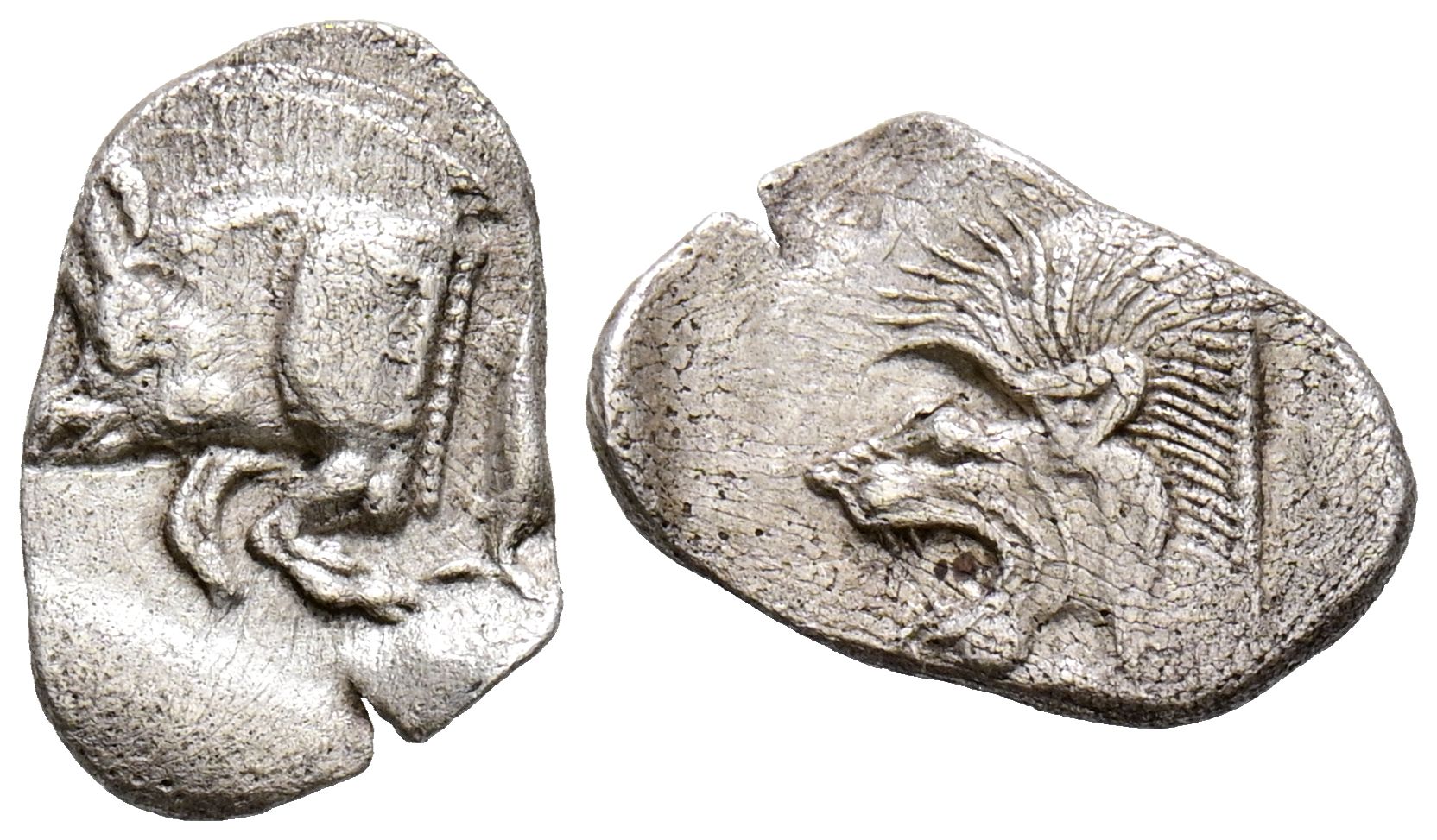 MISIA, Cícico. Obolo. (Ar. 0,81g/14mm). 450-400 a.C. (SNG France 361). Anv: Parte delantera de Jabalí a izquierda, detrás atún. Rev: Cabeza de león a izquierda dentro de cuadrado incuso. MBC+.