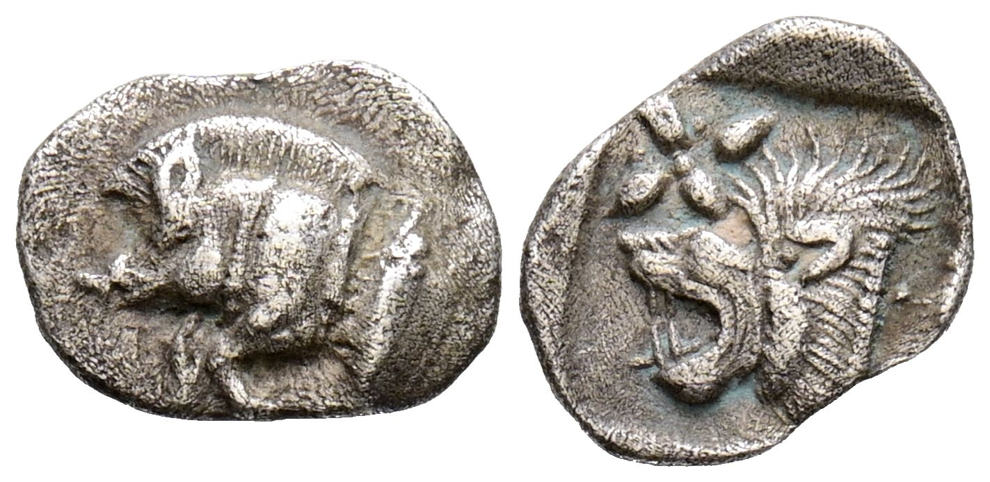 MISIA, Cícico. Obolo. (Ar. 0,44g/10mm). 450-400 a.C. (SNG France 361). Anv: Parte delantera de Jabalí a izquierda, detrás atún. Rev: Cabeza de león a izquierda dentro de cuadrado incuso. MBC.