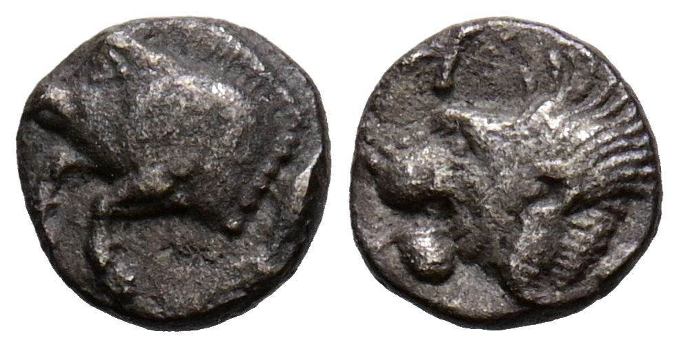 MISIA, Cícico. Obolo. (Ar. 0,36g/7mm). 450-400 a.C. (SNG France 361). Anv: Parte delantera de Jabalí a izquierda, detrás atún. Rev: Cabeza de león a izquierda dentro de cuadrado incuso. MBC.