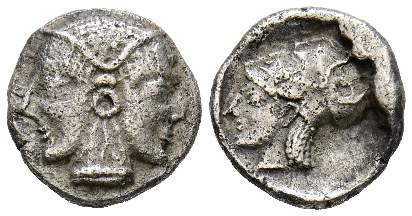 MISIA, Lampsakos. Obolo. (Ar. 0,96g/10mm). 500-450 a.C. (SNG Paris 1127). Anv: Cabeza femenina janiforme diademada y pendiente. Rev: Cabeza de Atenas con casco a izquierda. MBC.