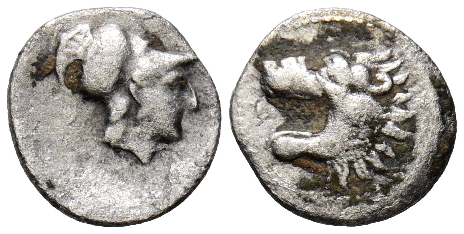PAMPHYLIA, Side. Obolo. (Ar. 0,55g/10mm). Siglo III-Siglo II a.C. (SNG BN 739). Anv: Cabeza de Atenas a derecha. Rev:Cabeza de león a izquierda. MBC-.
