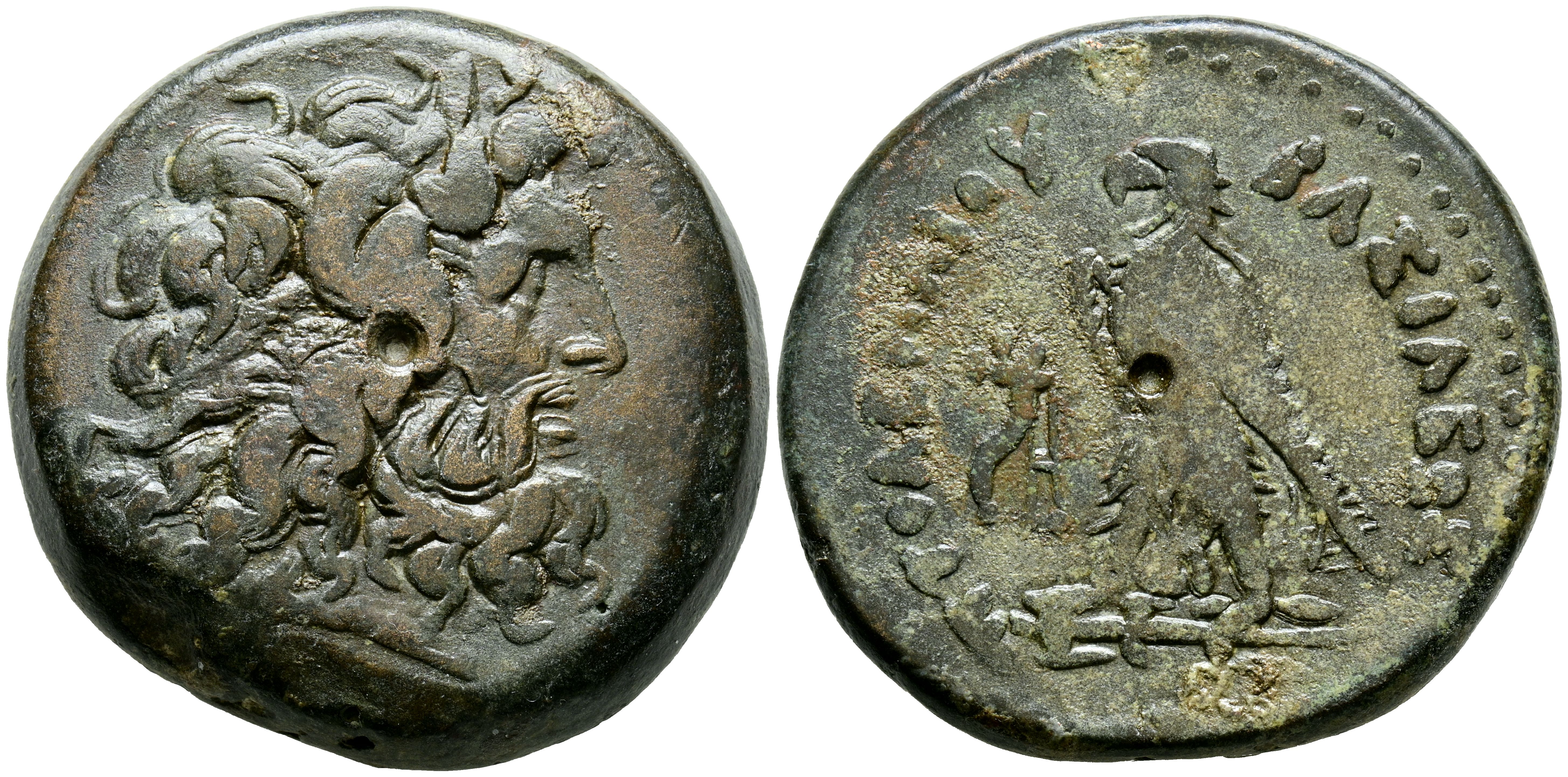 REINO PTOLEMAICO. Ptolomeo IV Philopator. Ae40. (Ae. 68,79g/40mm). 221-204 a.C. (Svoronos 1125; SNG Copenhagen 199). Anv: Cabeza laureada de Zeus a derecha. Rev: Aguila sobre rayo a izquierda, delante cornucopia, entre las patas AI, alrededor leyenda griega. MBC. Bonita pátina.