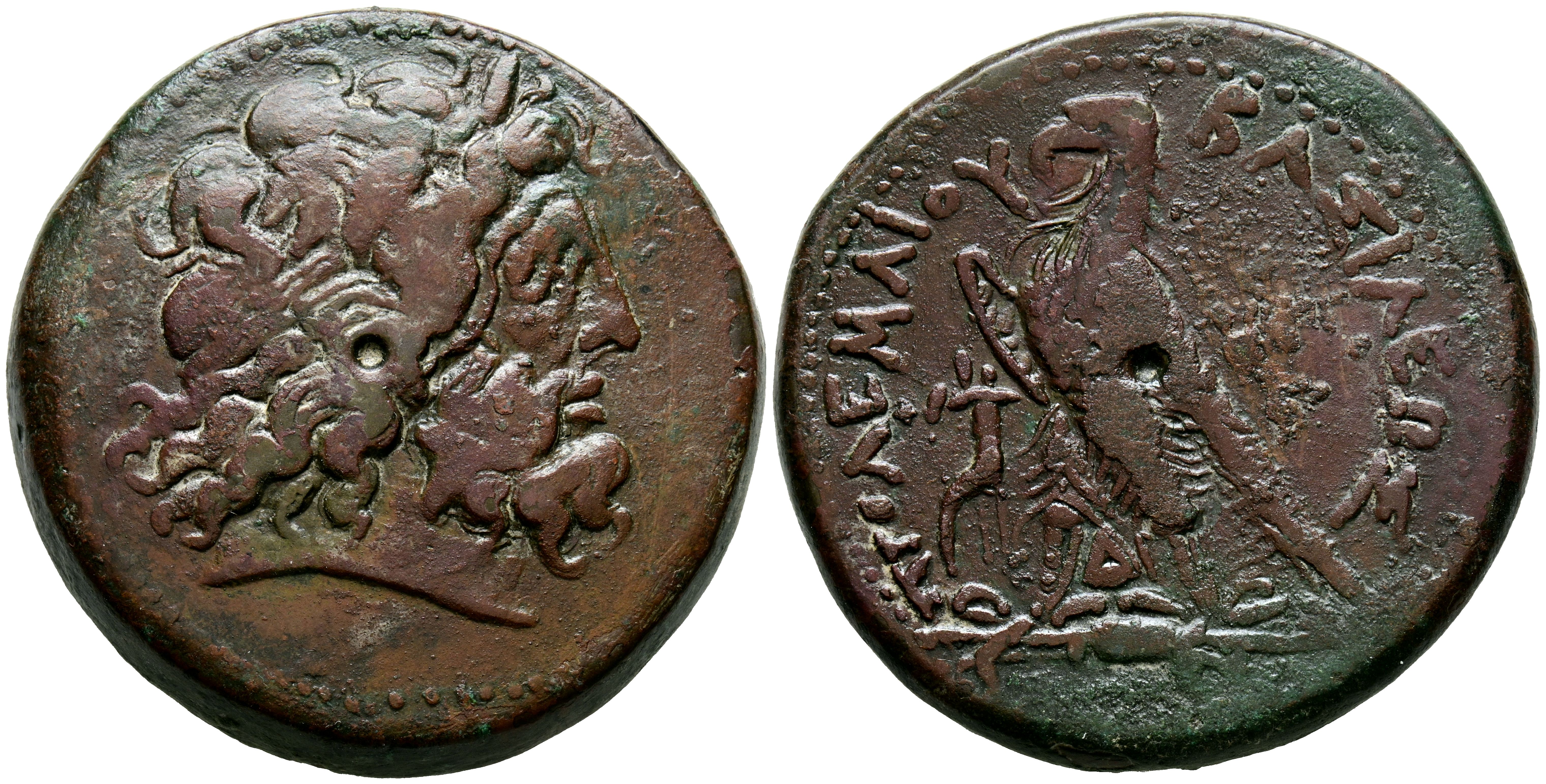 REINO PTOLEMAICO, Ptolomeo IV Philipator. Ae41. (Ae. 66,86g/41mm). 221-204 a.C. (Svoronos 1125; SNG Copenhagen 199). Anv: Cabeza laureada de Zeus a derecha. Rev: Aguila sobre rayo a izquierda, delante cornucopia, entre las patas AI, alrededor leyenda griega. MBC+. Bonita pátina. Precioso ejemplar, escaso así.