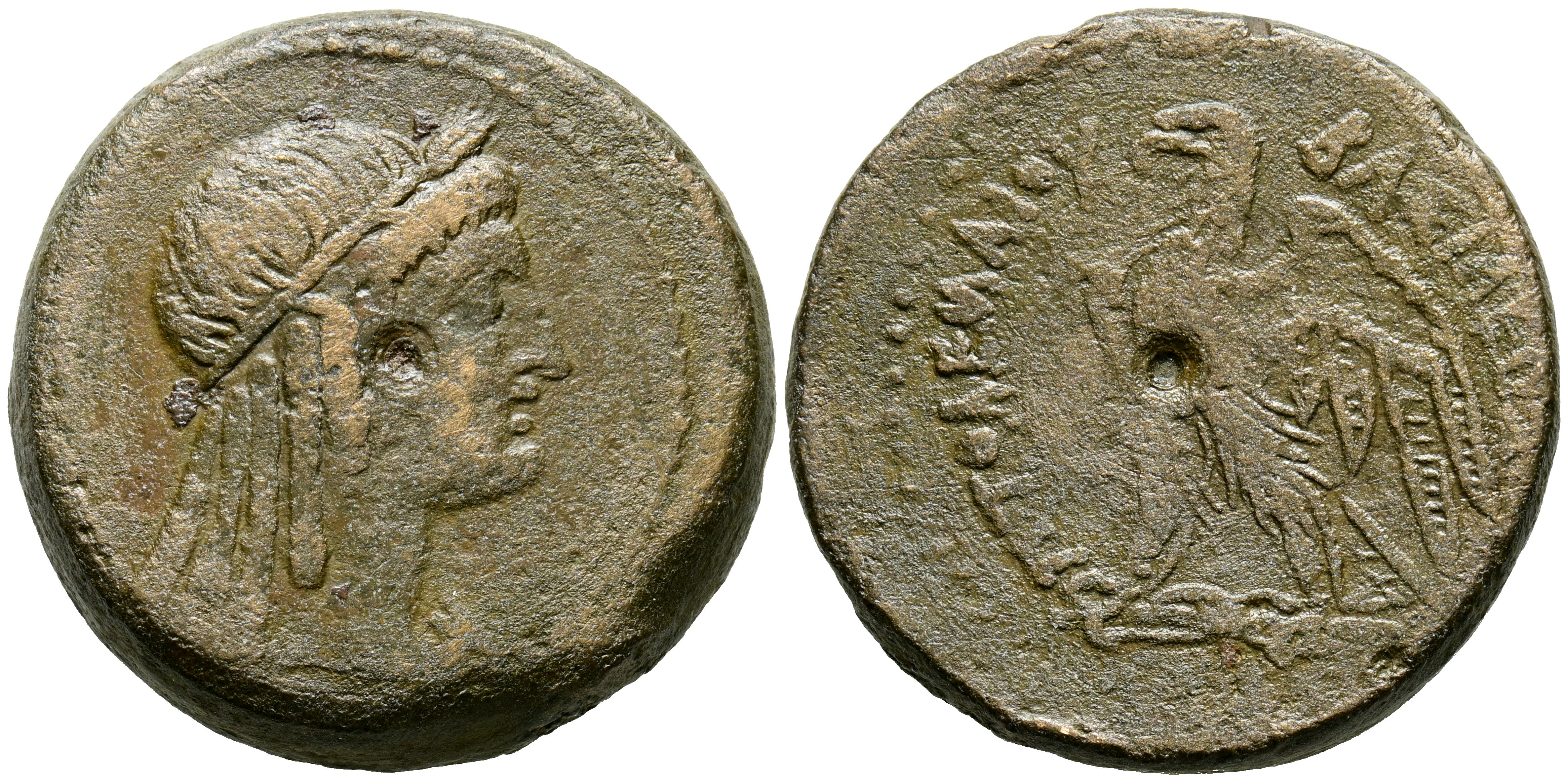 REINO PTOLEMAICO. Ptolomeo VI Filometor. Ae32. (Ae. 33,64g/32mm). 180-145 a.C. (Svoronos 1233; SNG Copenhagen 246). Anv: Cabeza de Isis a la derecha. Rev: Aguila de pie a la izquierda sobre un rayo y con alas abiertas, alrededor leyenda griega. MBC-.