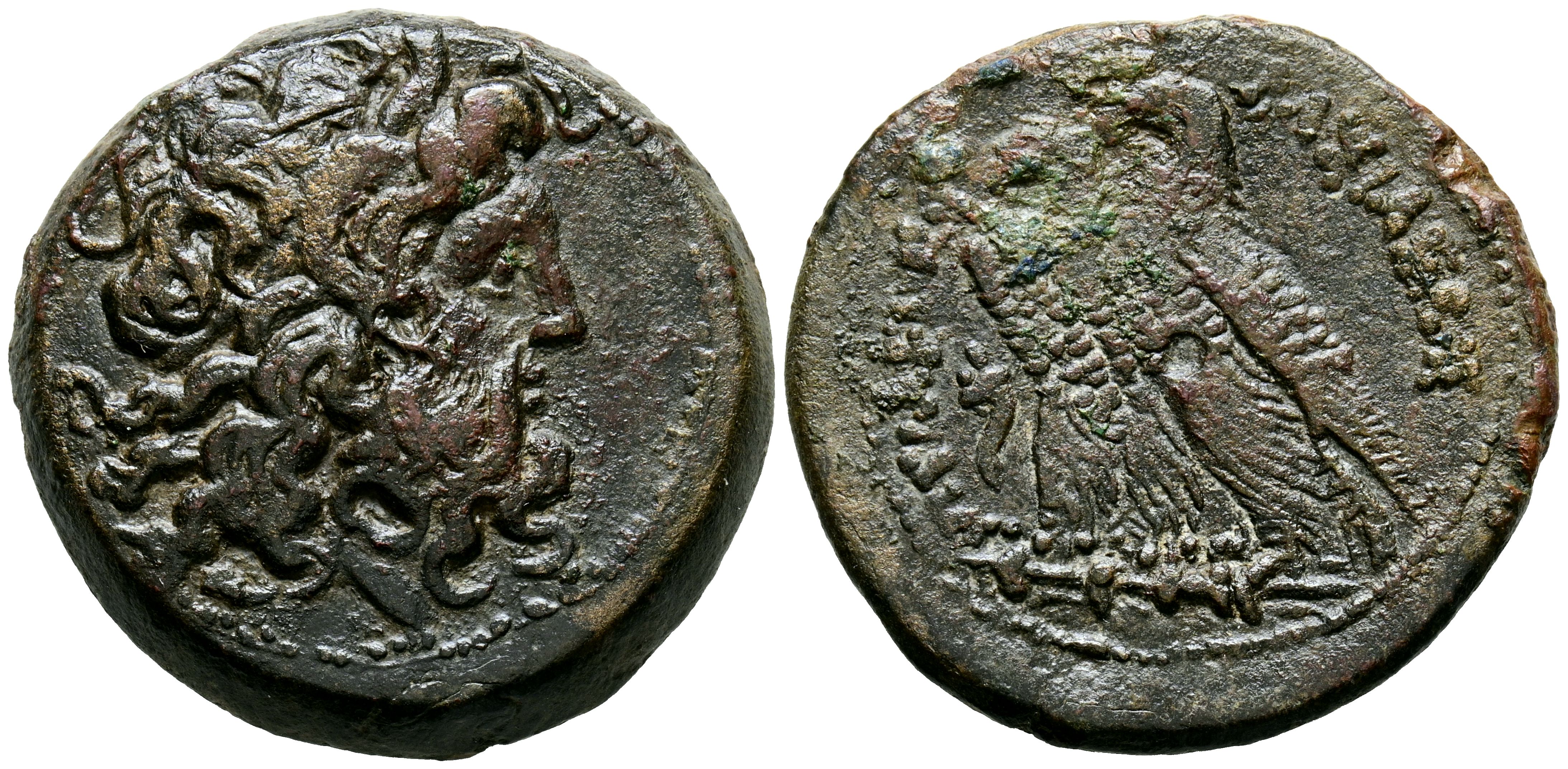 REINO PTOLEMAICO, Ptolomeo VI Philometor. Ae30 (Ae. 20,14g/30mm). 222-205/4 a.C. Alejandría. (Svoronos 1424; SNG Copenhagen 308). Anv: Cabeza de Zeus-Ammon diademada a la derecha. Rev: Dos águilas de pie a la izquierda sobre rayo y cornucopia a la izquierda, alrededor leyenda griega. MBC+.