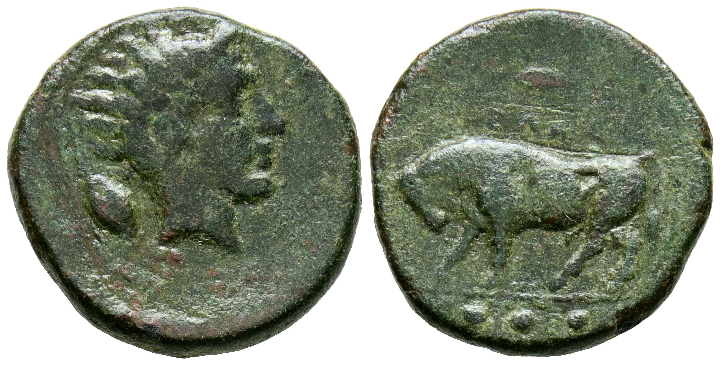 SICILIA, Gela. Tetras. (Ae. 3,53g/17mm). 420-405 a.C. (HGC 2, 379). Anv: Cabeza de la diosa Gelas a derecha, detrás grano de trigo. Rev: Toro embistiendo a izquierda, encima hoja de olivo y leyenda griega, debajo tres puntos. MBC-.