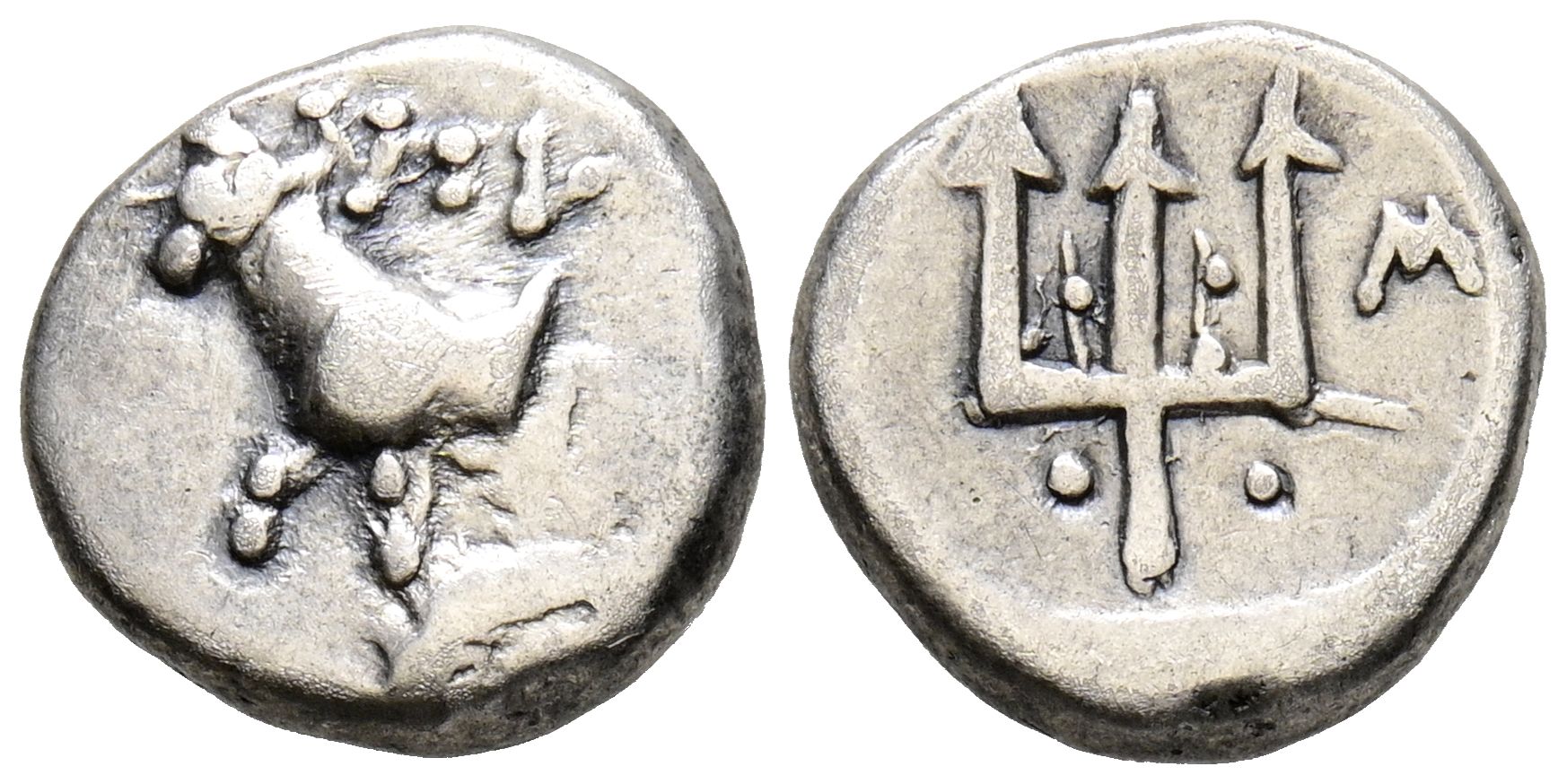 TRACIA, Byzantion. Hemidracma. (Ar. 1,93g/12mm). 387-340 a.C. (HGC 3.2, 1388). Anv: Parte delantera de vaca a izquierda, debajo delfín, encima dos letras griegas. Rev: Tridente. MBC.