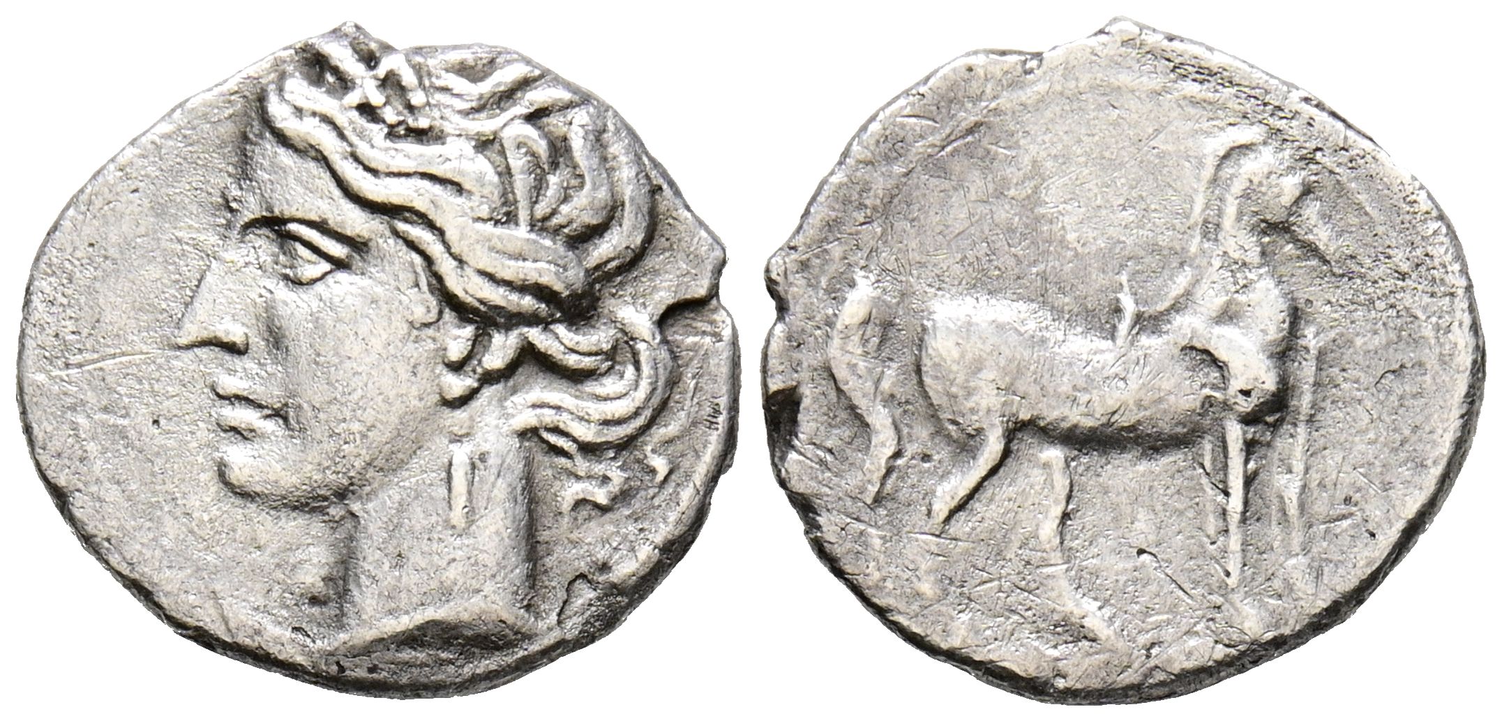 ZEUGITANIA, Cártago. 1/4 Shekel. (Ar. 1,56g/15mm). 220-210 a.C. (Seaby 6499; SNG Copenhagen 369). Anv: Cabeza de tanit a izquierda. Rev: Caballo parado a derecha. MBC.