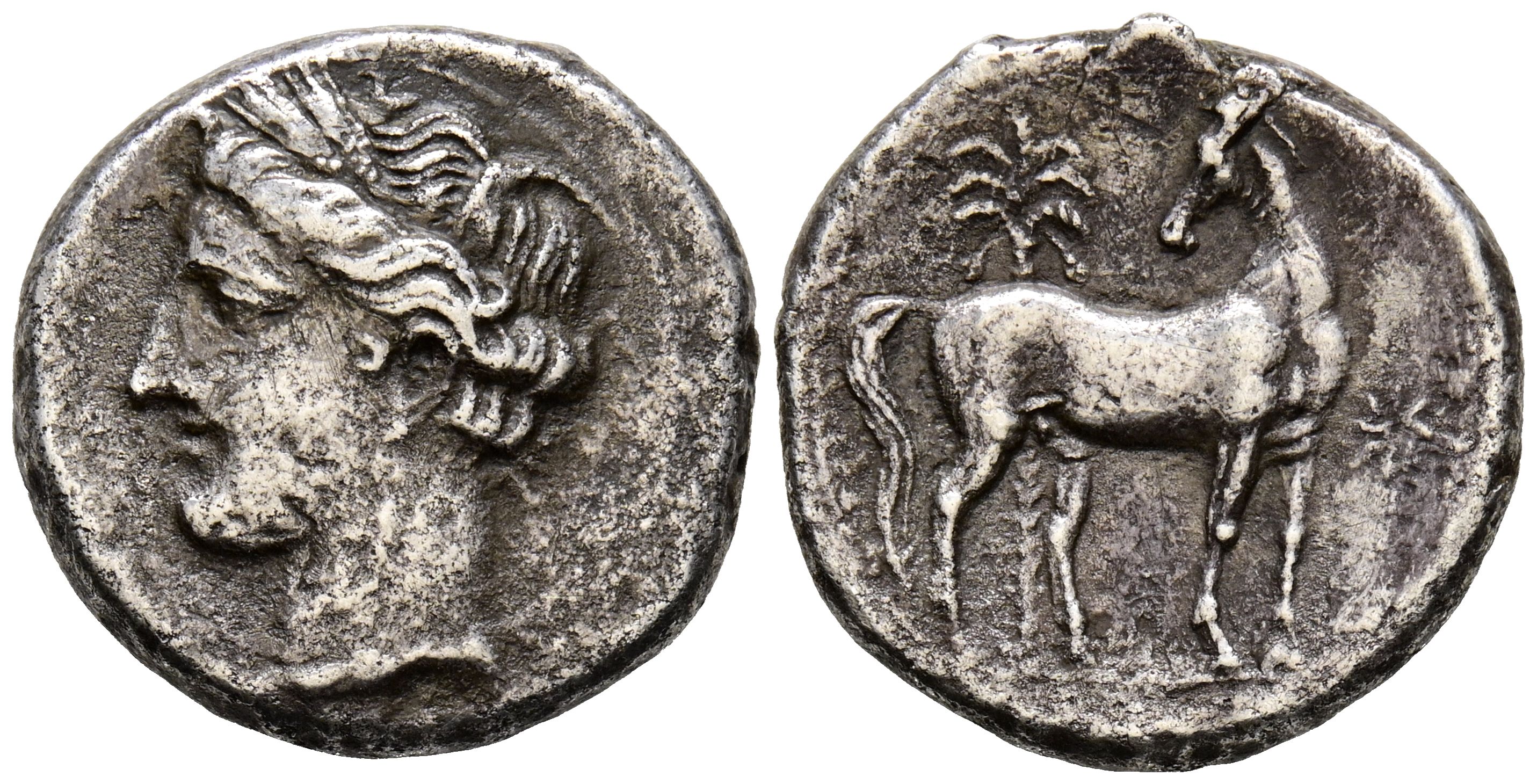 ZEUGITANA, Cártago. Shekel. (Ar. 6,59g/20mm). 300-260 a.C. (SNG Copenhagen 141). Anv: Cabeza diademada de Tanit a izquierda. Rev: Caballo estante a derecha mirando a izquierda, detrás palmera, delante estrella. MBC. Escaso ejemplar.
