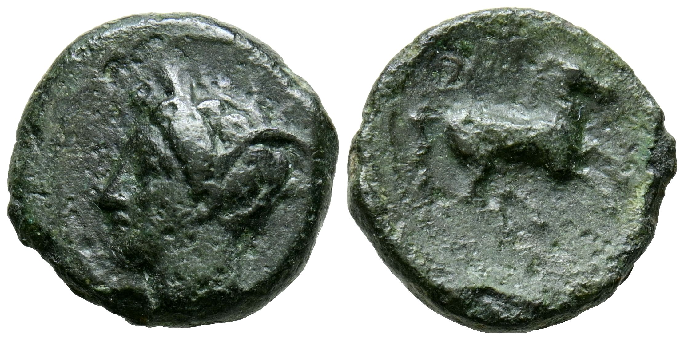 ZEUGITANIA, Cártago. Ae17. (Ae. 2,75g/15mm). 400-350 a.C. (SNG Copenhagen 98). Anv: Cabeza diademada de Tanit a izquierda. Rev: Caballo saltando a derecha. MBC-.