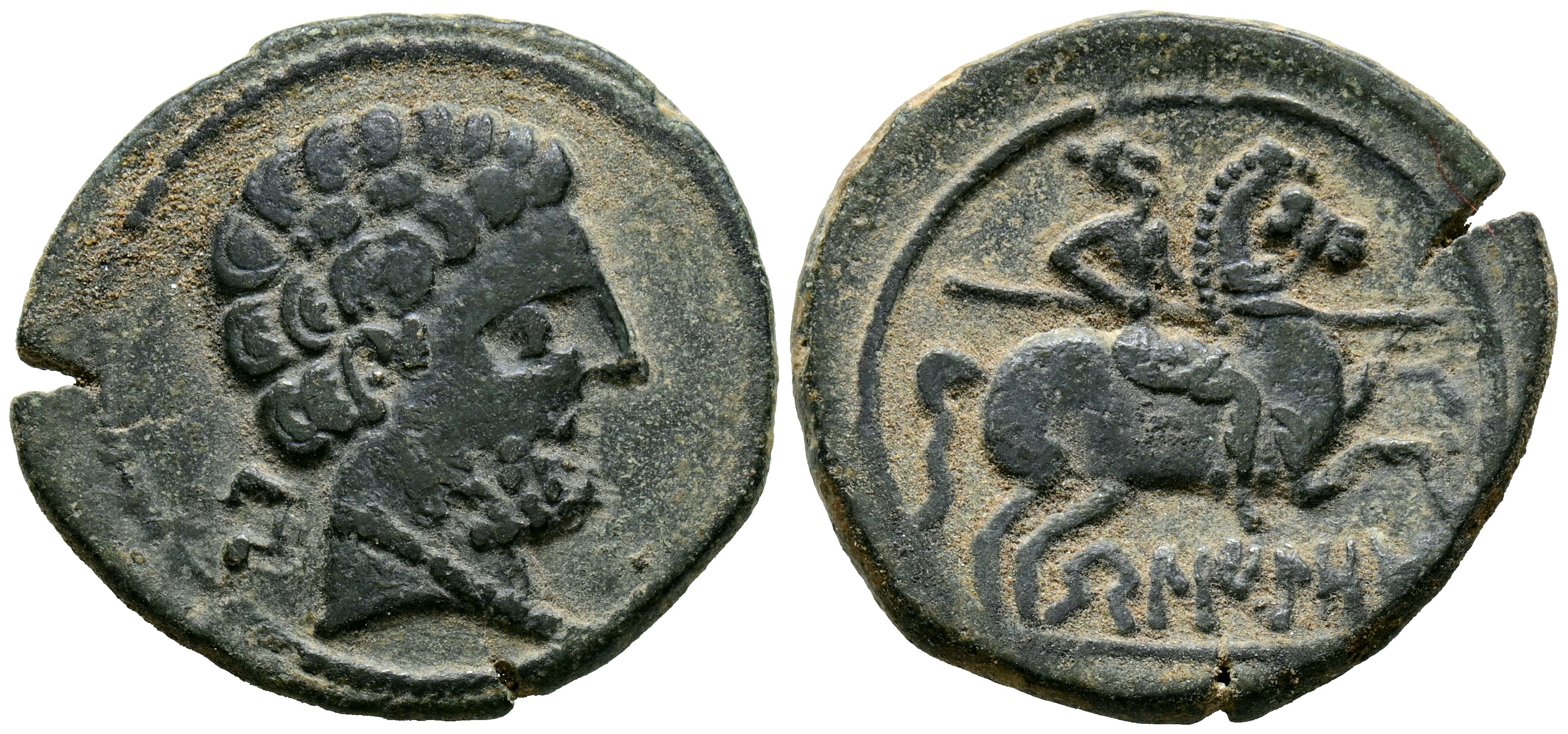 BELIGIOM (Belchite, Zaragoza). As. (Ae. 8,42g/26mm). 120-20 a.C. (FAB-243). Anv: Cabeza masculina barbada a derecha, detrás letra ibérica: Be. Rev: Jinete con lanza a derecha, debajo leyenda ibérica: BeLIGiOM. MBC.