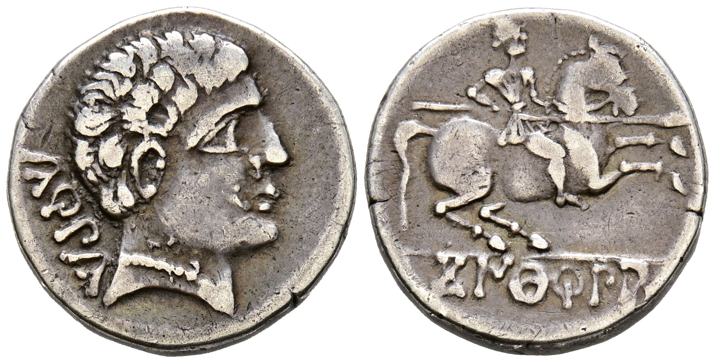 CONTERBIA CARBICA (Huete, Cuenca). Denario. (Ar. 4,10g/18mm). 120-80 a.C. (FAB-845). Anv: Cabeza masculina a derecha, detrás leyenda: CaRBICA. Rev: Jinete con lanza a derecha, debajo leyenda ibérica bajo leyenda: CoNTERBiA. MBC. Escaso.