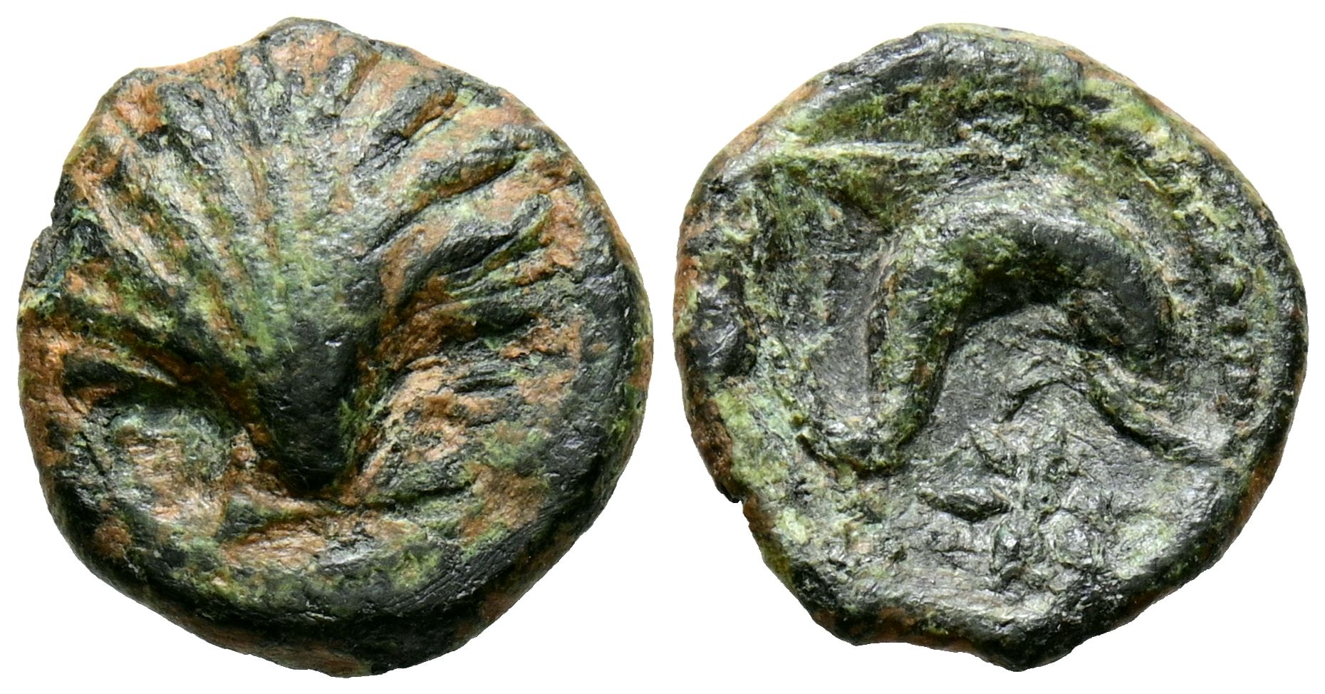 ARSE-SAGUNTO (Sagunto, Valencia). Sextante. (Ae. 1,55g/13mm). 170-20 a.C. (FAB-2064). Anv: Concha. Rev: Delfín a derecha, encima creciente, debajo letra ibérica A y estrella. MBC.