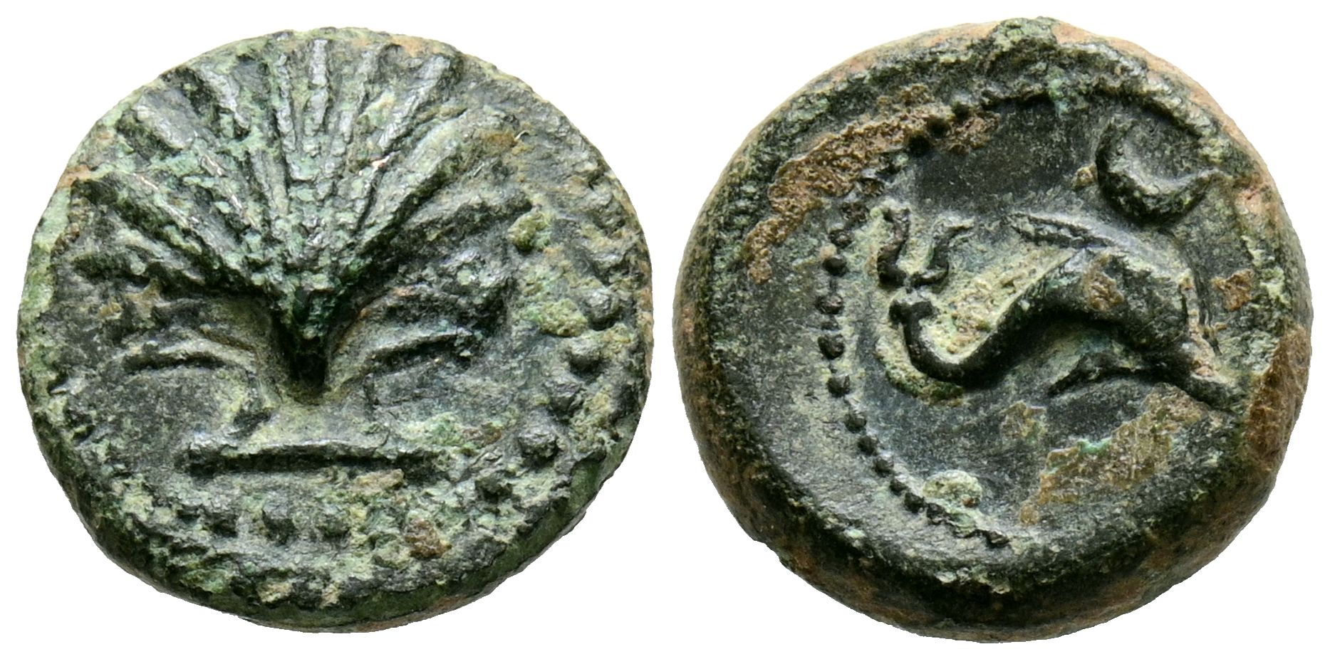 ARSE-SAGUNTO (Sagunto, Valencia). Sextante. (Ae. 1,89g/12mm). 170-20 a.C. (FAB-2065). Anv: Concha. Rev: Delfín a derecha, encima creciente. MBC+.