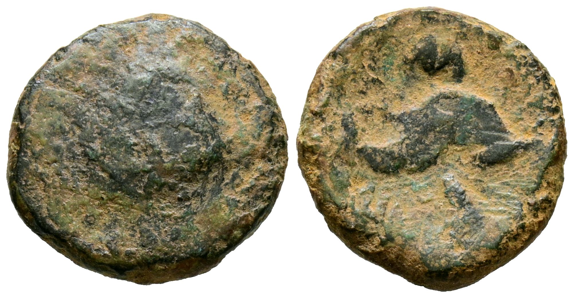 ARSE-SAGUNTO (Sagunto, Valencia). Sextante. (Ae. 2,14g/14mm). 170-20 a.C. (FAB-2067). Anv: Concha. Rev: Delfín a derecha, encima M. BC/MBC-.