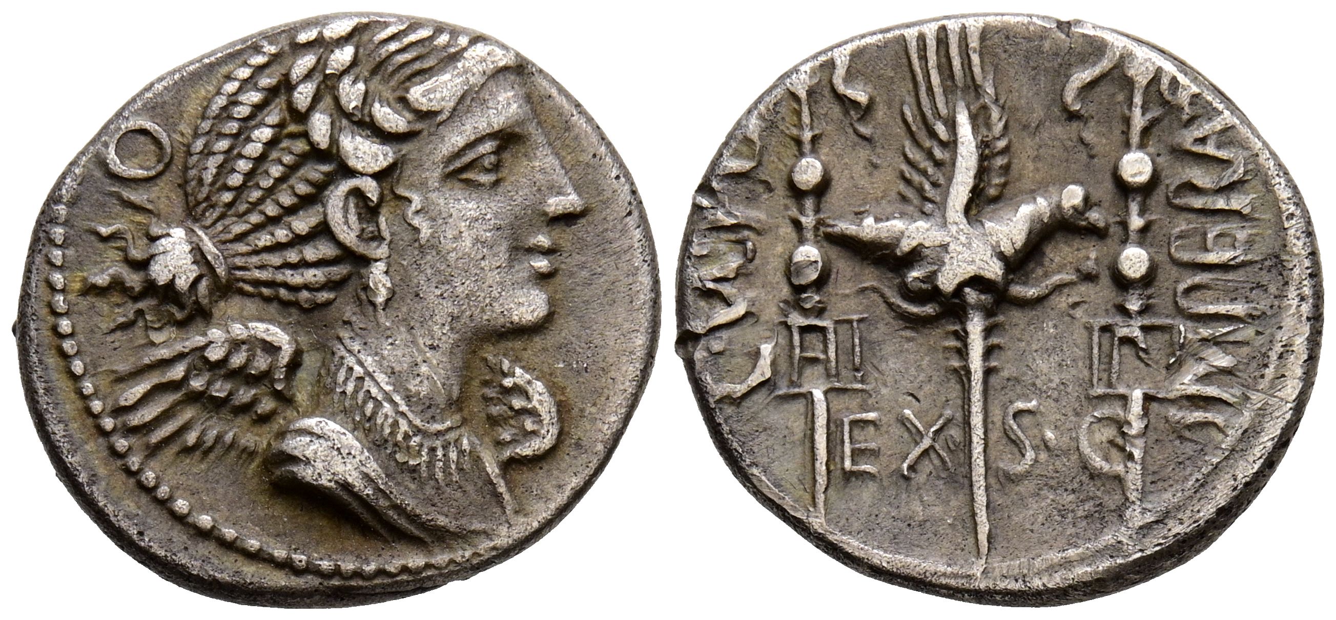 GENS VALERIA. Denario. (Ar. 3,82g/18mm). 82 a.C. Galia. (FFC 1167; Crawford 365/1b). Anv: Busto alado de Victoria a derecha, detrás letra B. Rev: Aguila legionaria entre dos insignias militares, en una de ellas se lee: H ("Hastati"), y en la otra: P ("Principes"), debajo leyenda: EX-SC, a ambos lados leyenda: C VAL FLA IMPERAT. MBC+.