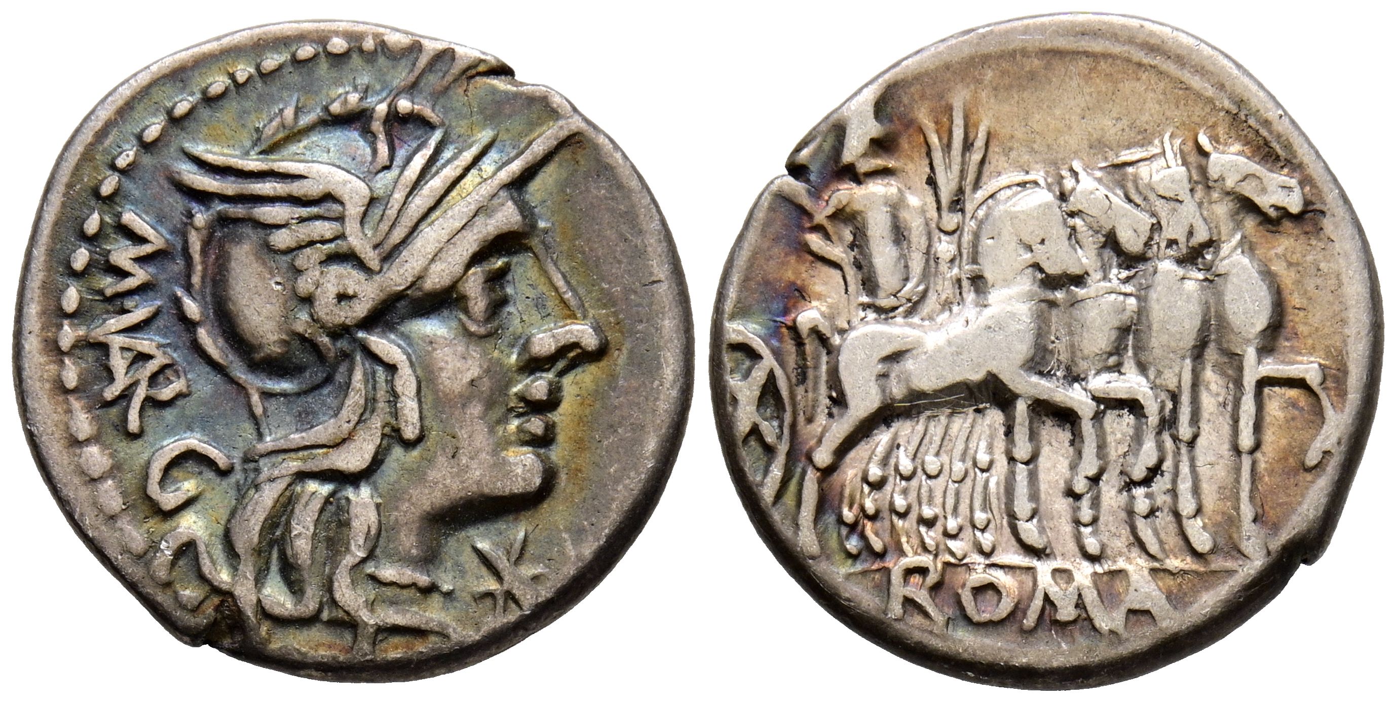 GENS VARGUNTEIA. Denario. (Ar. 3,85g/20mm). 130 a.C. Roma. (FFC 1183; Crawford 257/1). Anv: Cabeza de Roma a derecha, delante estrella, detrás leyenda: M VARG. Rev: Júpiter en cuádriga a derecha con rama de palma y haz de rayos, en exergo: ROMA. MBC.