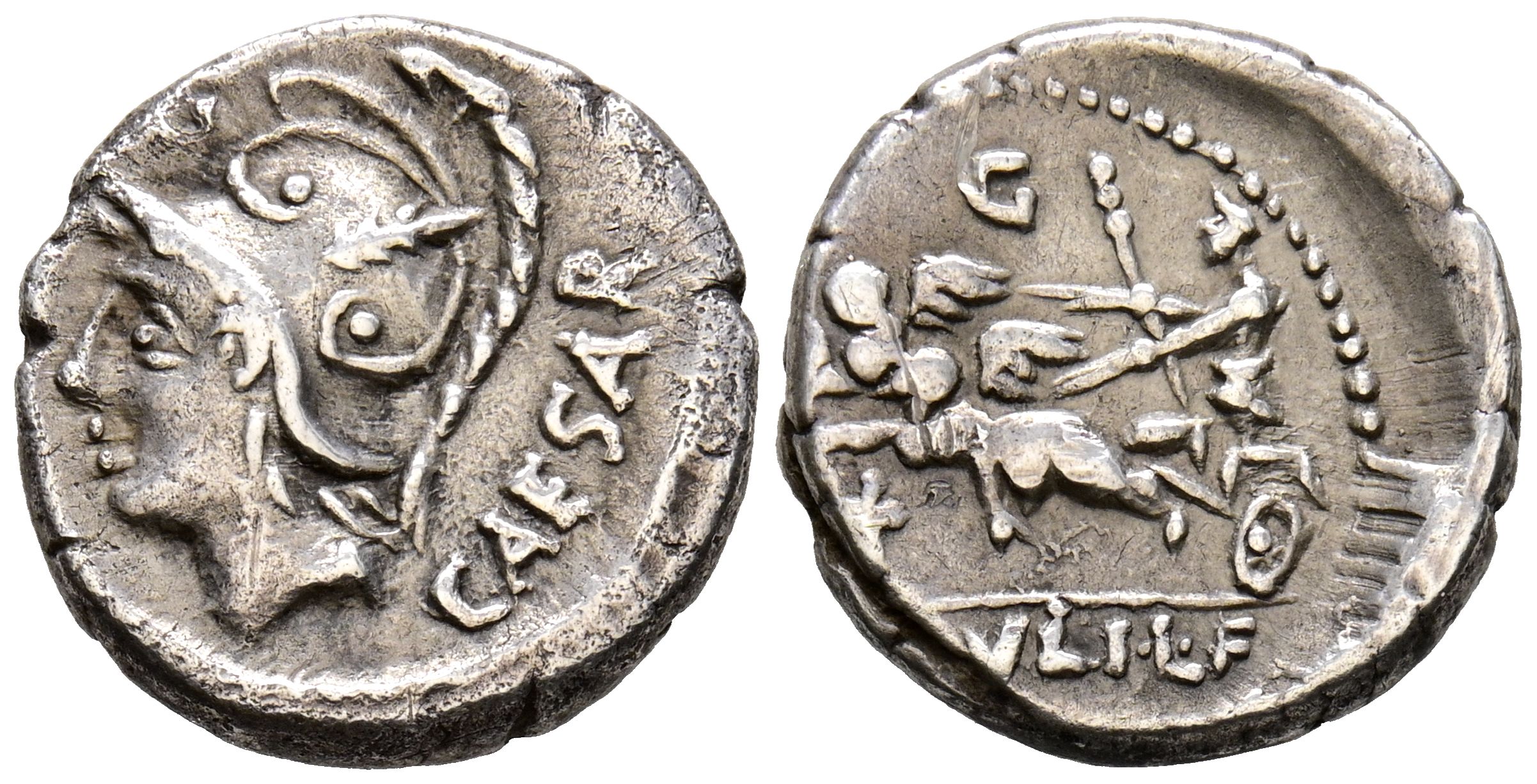 JULIO CESAR. Denario. (Ar. 3,58g/17mm). 103 a.C. Roma. (Crawford 320/1). Anv: Cabeza de Marte con casco a derecha, detrás: CAESAR. Rev: Venus con cetro conduciendo biga de cupidos, encima G, en exergo: L IVLI L F. MBC.