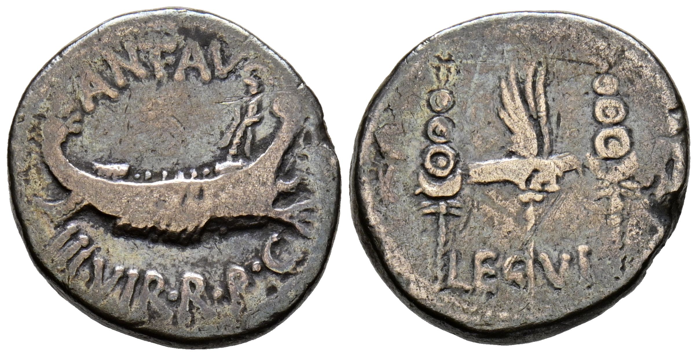 MARCO ANTONIO. Denario. (Ar. 3,13g/17mm). 32-31 a.C. Ceca volante. (Crawford 544/18; FFC 36). Anv: Galera Pretoriana a derecha, alrededor leyenda: ANT AVG III VIR RPC. Rev: Aguila legionaria entre dos estandartes, entre ellas: LEG-VI. BC+.