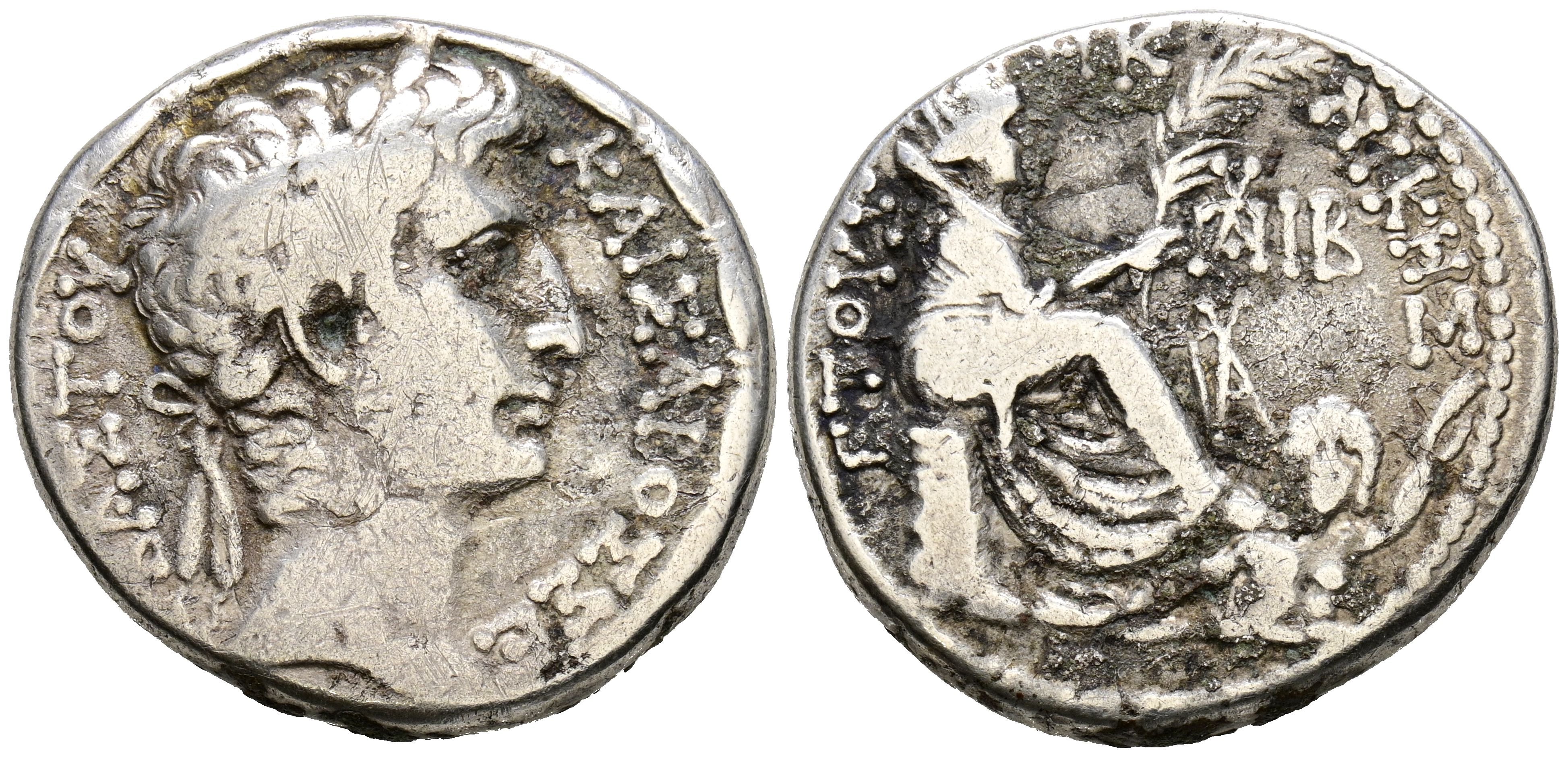 OCTAVIO. Cistóforo. (Ar. 14,07g/27mm). 5 a.C. Antioquía. (RPC 4151). Anv: Cabeza laureada de Augusto a derecha, alrededor leyenda. Rev: Tyche de Antioquía sentada a derecha portando palma con pie sobre el dios Orontes, delante monogramas, alrededor leyenda. MBC-.