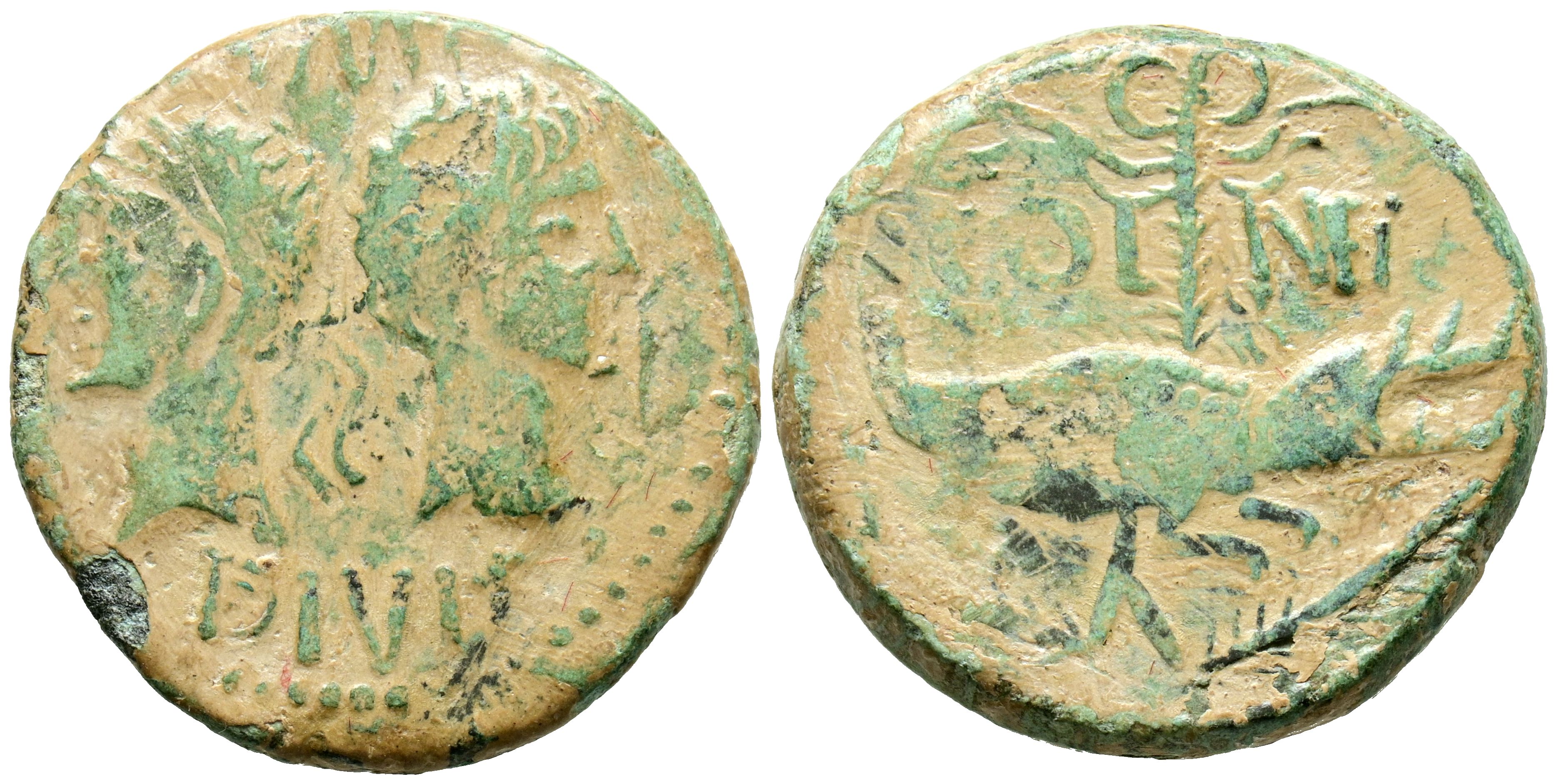 AUGUSTO. As. (Ae. 11,13g/26mm). 10-14 d.C. Colonia Nemasus. (RIC 158). Anv: Busto laureado de Augusto a izquierda, detrás busto laureado de Agripa a derecha, encima: IMP, debajo: DIVI F. Rev: Cocodrilo a derecha atado a palma, en campo corona de laurel, encima COL-NEM. MBC-.