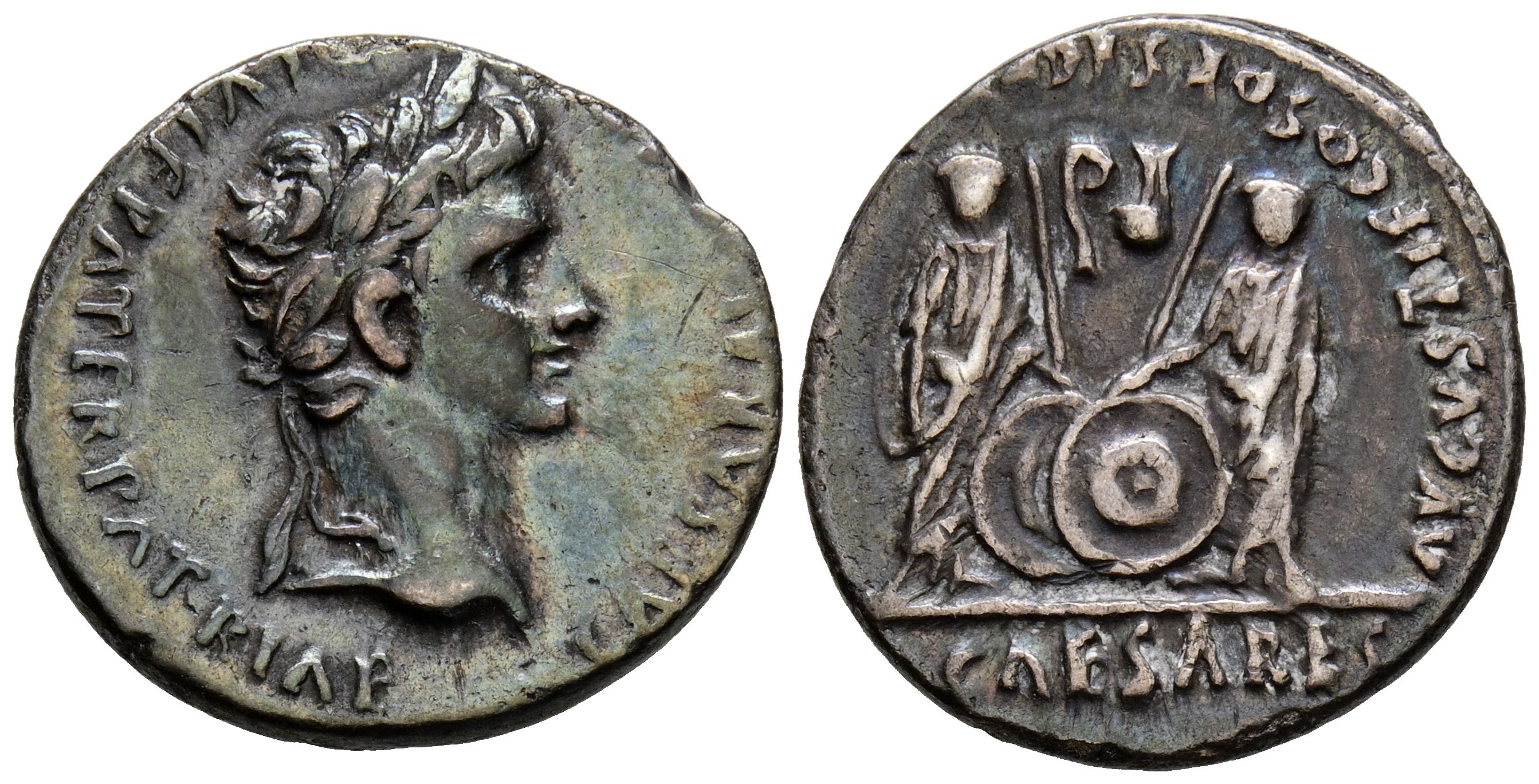 AUGUSTO. Denario. (Ar. 3,78g/19mm). 7-6 a.C. (RIC 207). Anv: Cabeza laureada de Augusto a derecha, alrededor leyenda: CAESAR AVGVSTVS DIVI F PATER PATRIAE. Rev: Cayo y Lucio estantes de frente, entre ellos escudo y lanzas, en campo símpulo y lítuo, en exergo: CL CAESARES, alrededor leyenda: AVGVSTI F COS DESIG PRINC IVVENT. MBC+. Tono irisado.