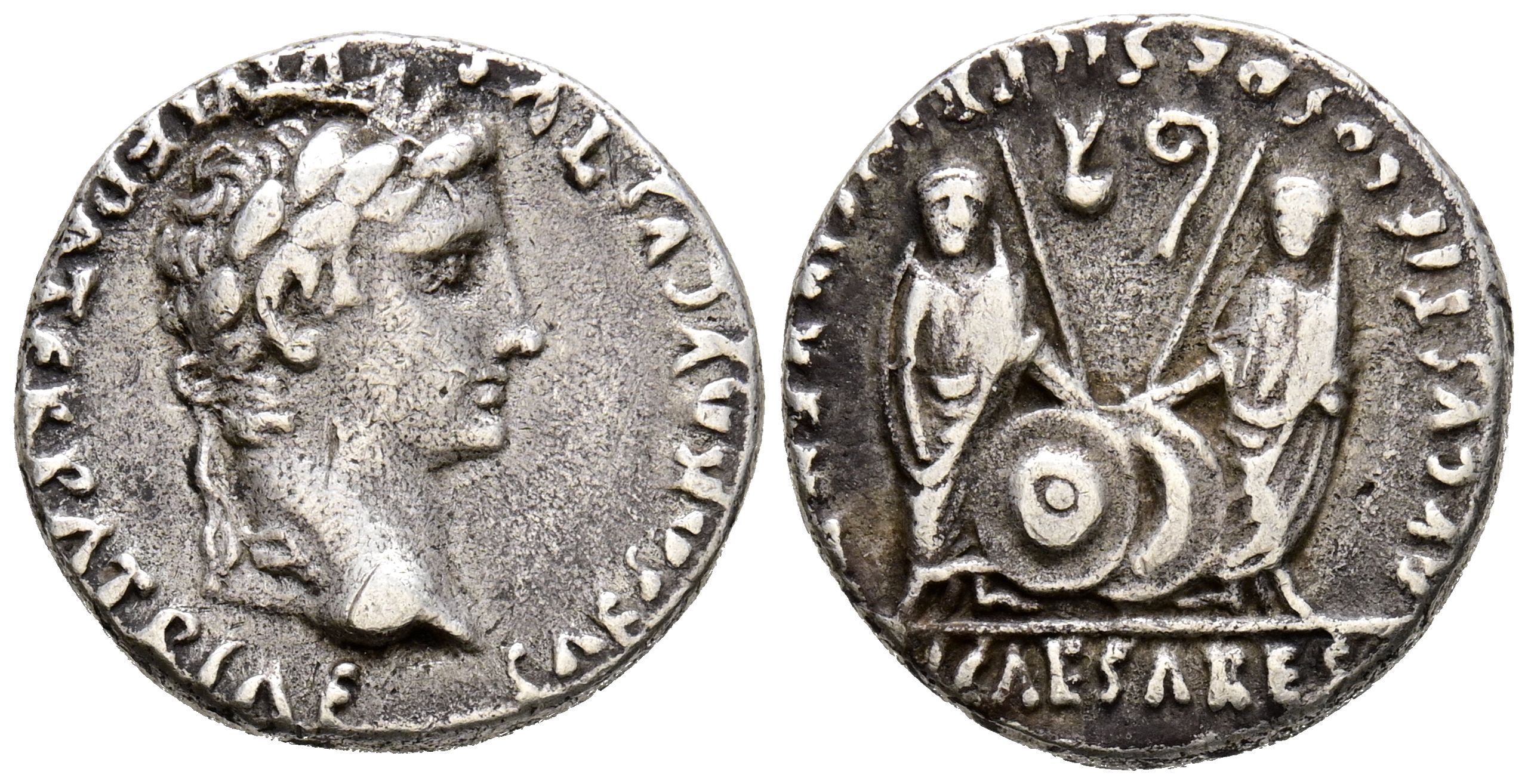 AUGUSTO. Denario. (Ar. 3,69g/18mm). 7-6 a.C. (RIC 207). Anv: Cabeza laureada de Augusto a derecha, alrededor leyenda: CAESAR AVGVSTVS DIVI F PATER PATRIAE. Rev: Cayo y Lucio estantes de frente, entre ellos escudo y lanzas, en campo símpulo y lítuo, en exergo: CL CAESARES, alrededor leyenda: AVGVSTI F COS DESIG PRINC IVVENT. MBC.
