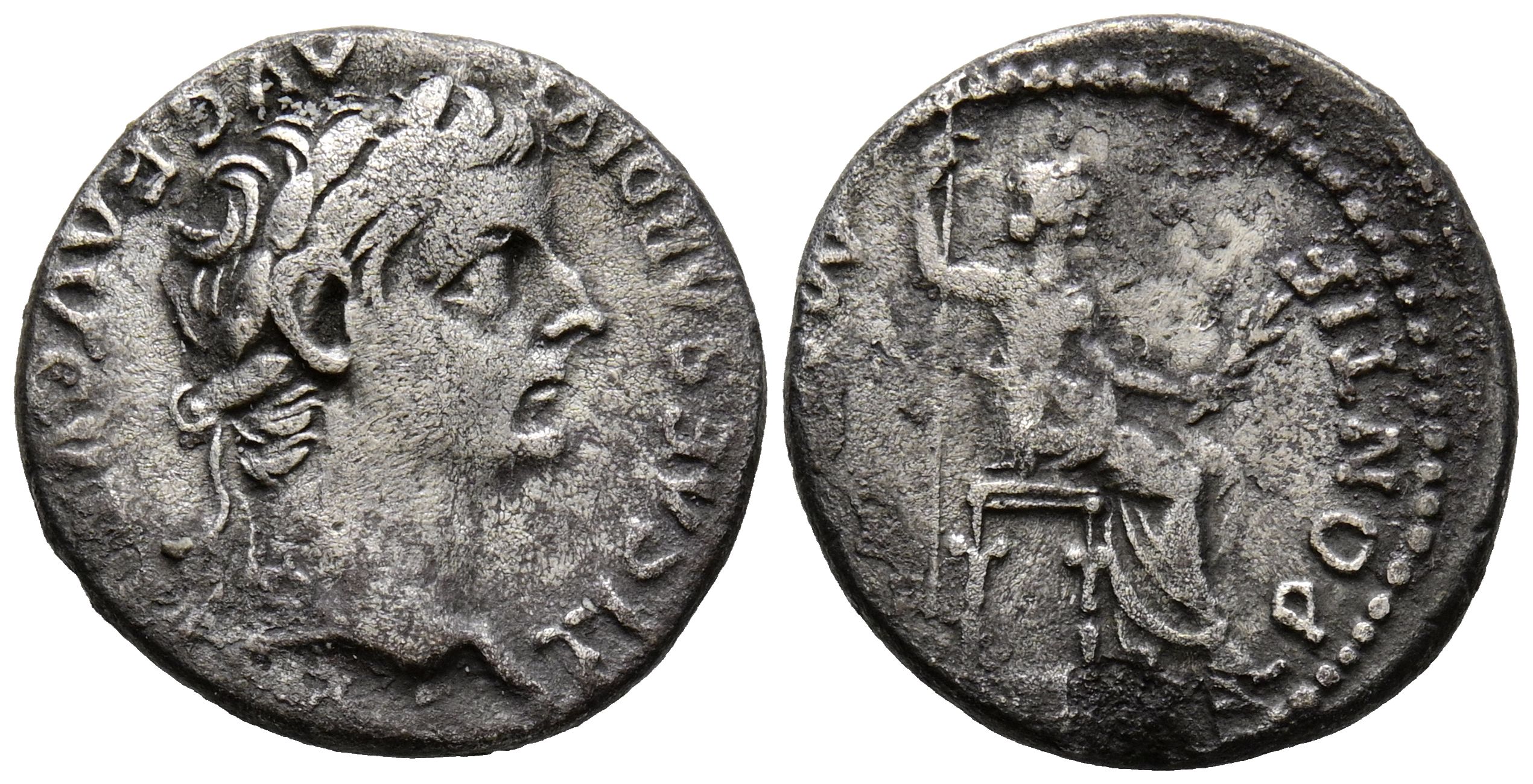 TIBERIO. Denario. (Ar. 3,41g/17mm). 14-37 d.C. Lugdunum. (RIC 30). Anv: Cabeza laureada de Tiberio a derecha portando cetro, alrededor leyenda: TI CAESAR DIVI AVGVSTVS. Rev: Livia sentada a derecha, alrededor leyenda: MAXIM PONTIF. MBC.