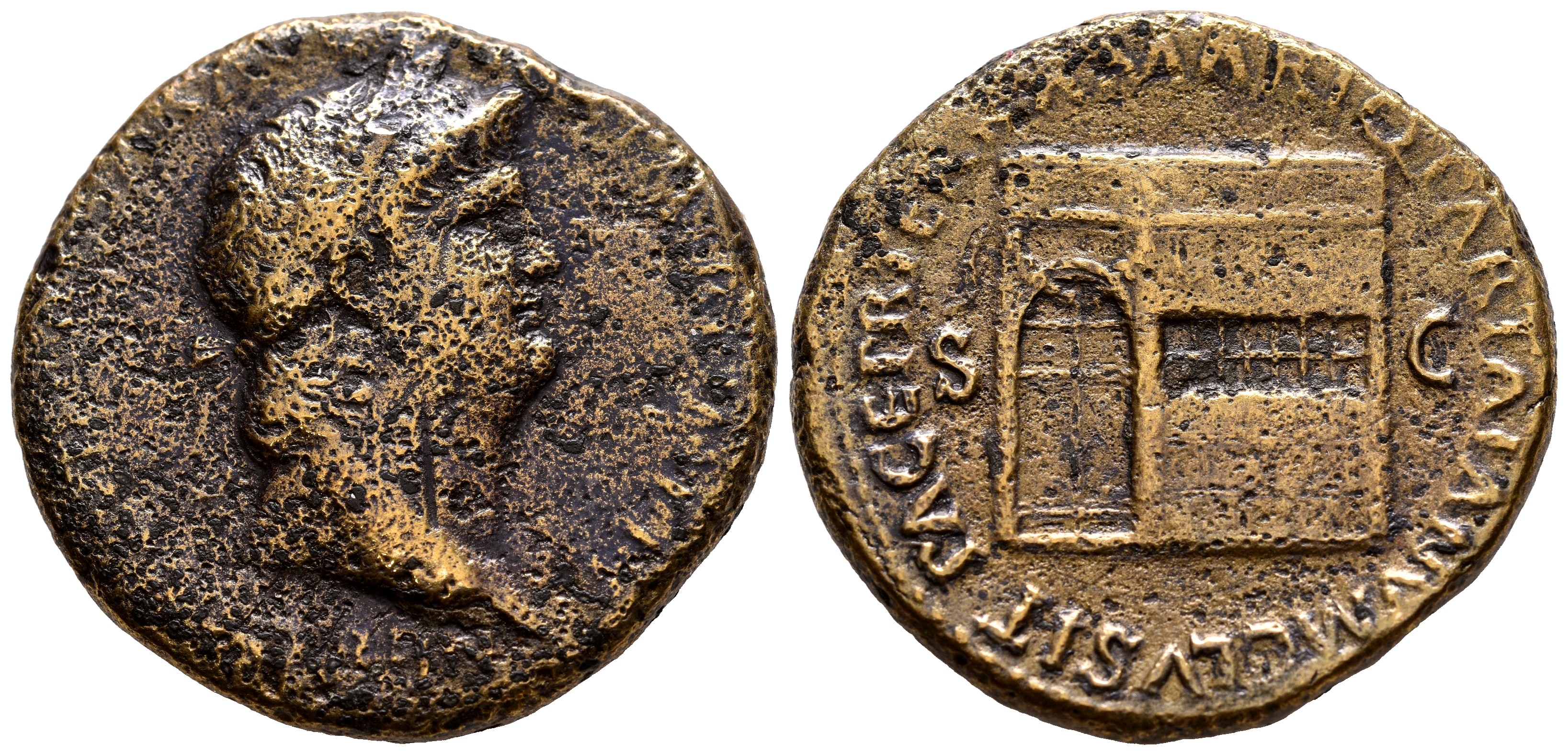 NERON. Sestercio. (Ae. 23,74g/35mm). 65 d.C. Roma. (RIC 264). Anv: Busto laureado de Nerón a derecha, debajo globo, alrededor leyenda: NERO CLAVD CAESAR AVG GER P M TR P IMP P P. Rev: Templo de Jano de frente, entre S-C, alrededor leyenda: PACE P R TERRA MARIQ PARTA IANVM CLVSIT. BC+/MBC-. Limpiado.