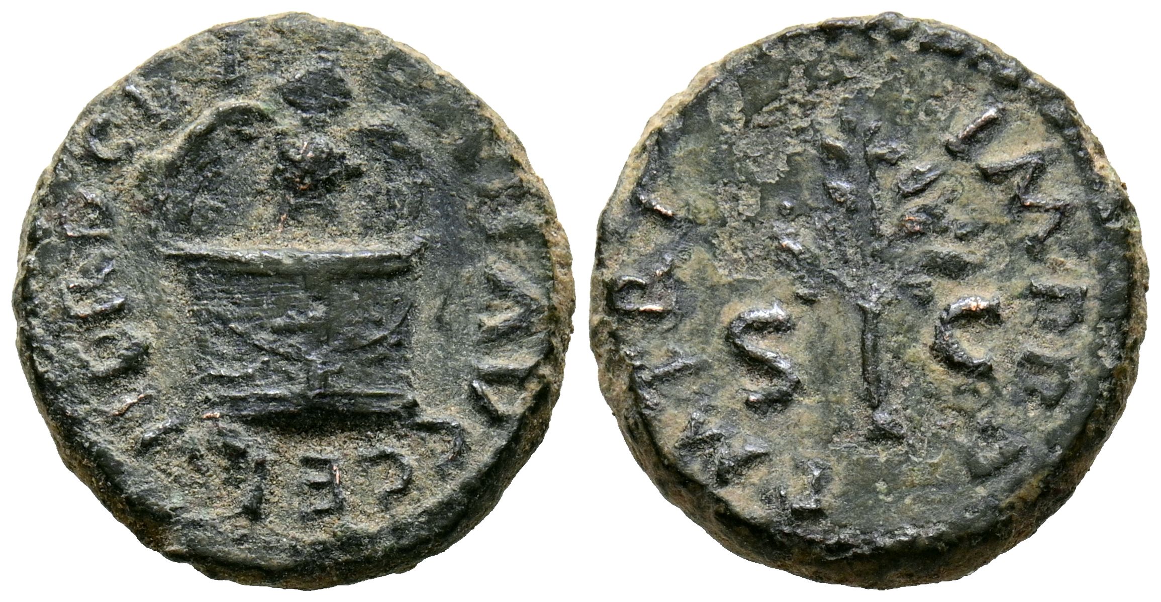 NERON. Cuadrante. (Ae. 3,36g/16mm). 65 d.C. Roma. (RIC 319). Anv: Búho estante sobre altar decorado, alrededor leyenda: NERO CLAV CAE AVG GER. Rev: Rama, entre S-C, alrededor leyenda: P M TR P IMP P P. MBC.