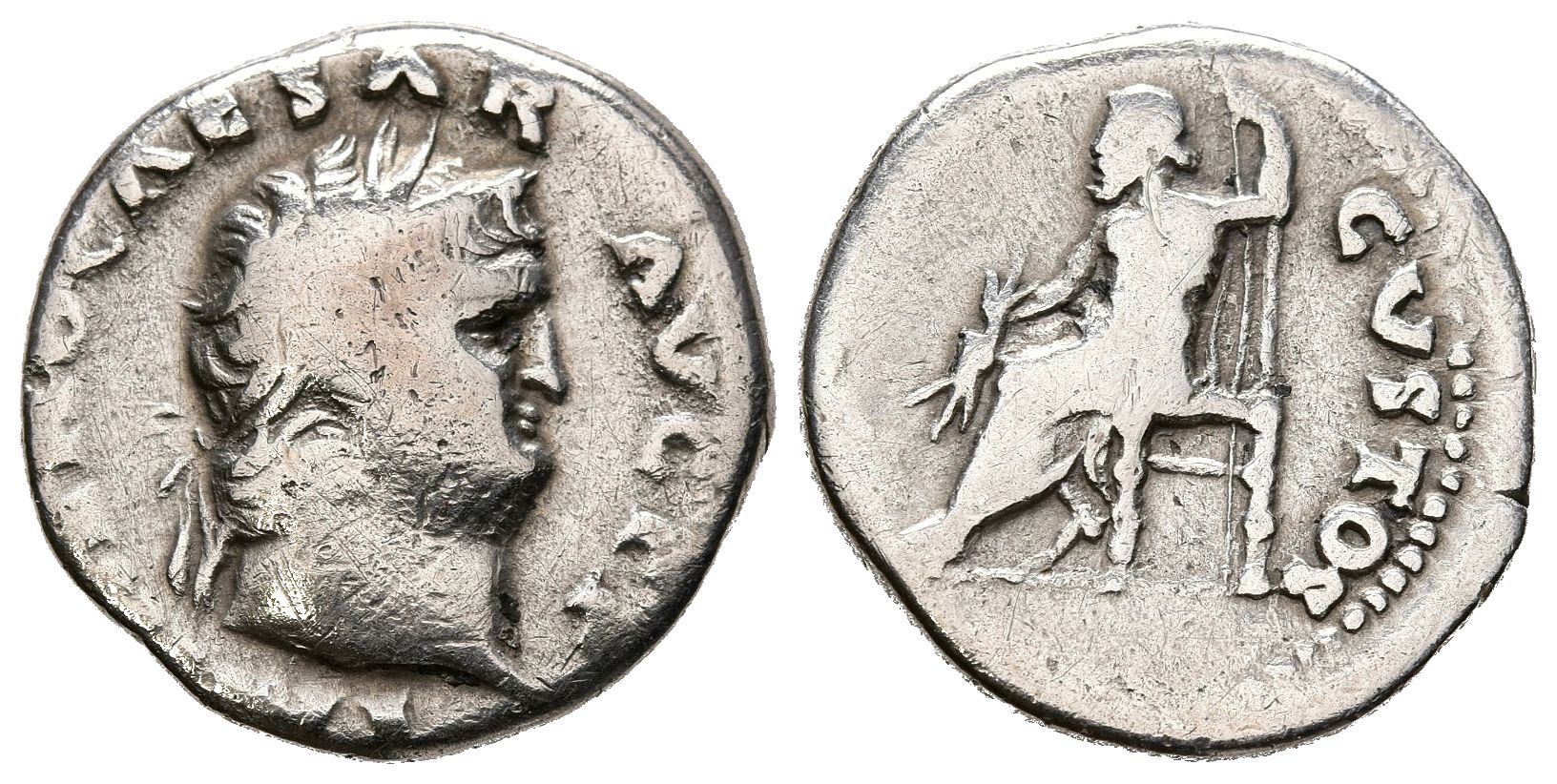 NERON. Denario. (Ar. 2,68g/17mm). 67-68 d.C. Roma. (RIC 45). Anv: Cabeza laureada de Nerón a derecha, alrededor leyenda: NERO CAESAR AVGVSTVS. Rev: Júpiter sentado a izquierda portando cetro y haz de rayos, alrededor leyenda: IVPPITER CVSTOS. MBC-.