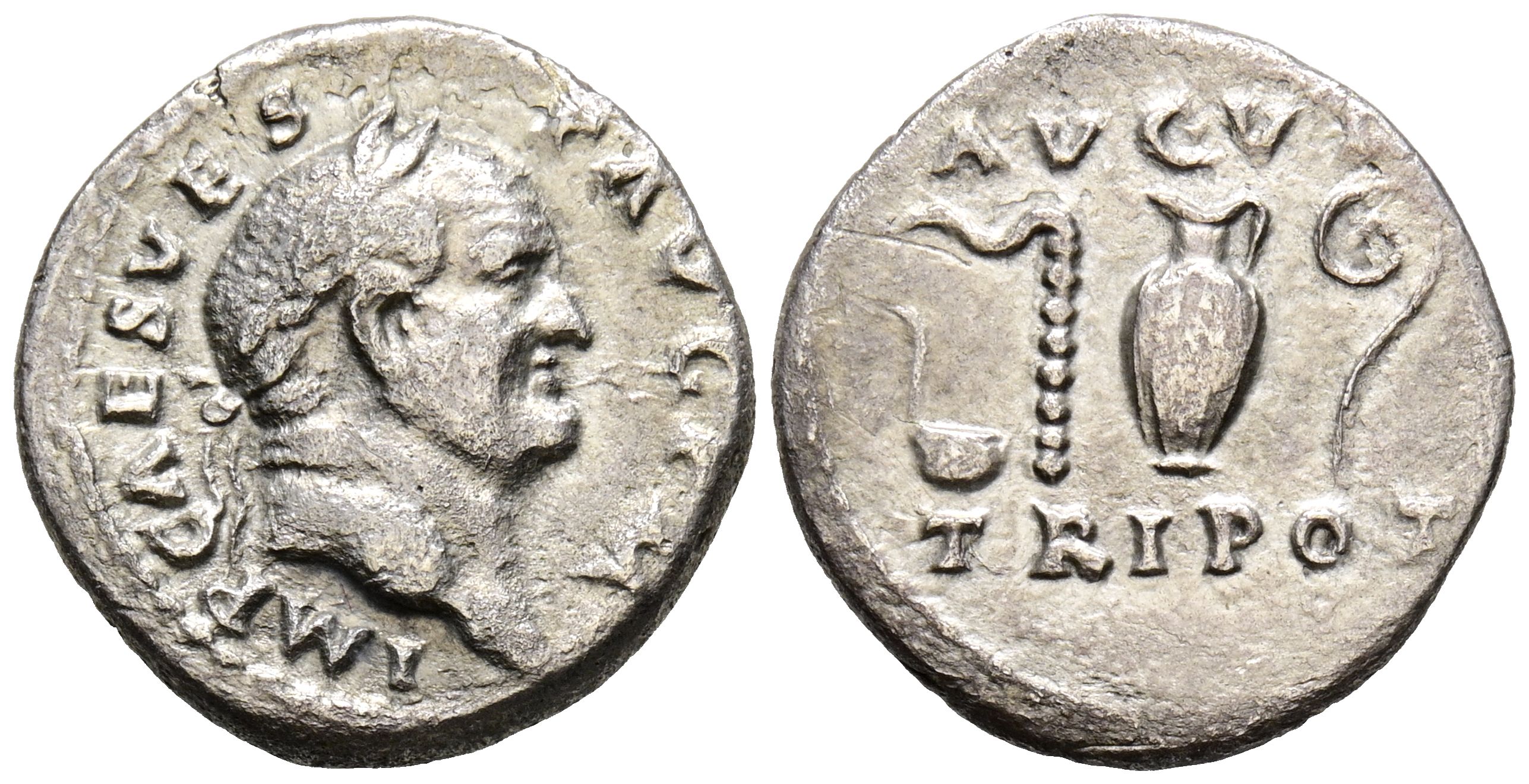 VESPASIANO. Denario. (Ar. 2,86g/18mm). 72-73 d.C. Roma. (RIC 356). Anv: Cabeza laureada de Vespasiano a derecha, alrededor leyenda: IMP CAES VESP AVG P M COS IIII. Rev: Elementos religiosos: Símpulo, cetro, jarra y lítuo, alrededor leyenda: AVGVR TRI POT. MBC.