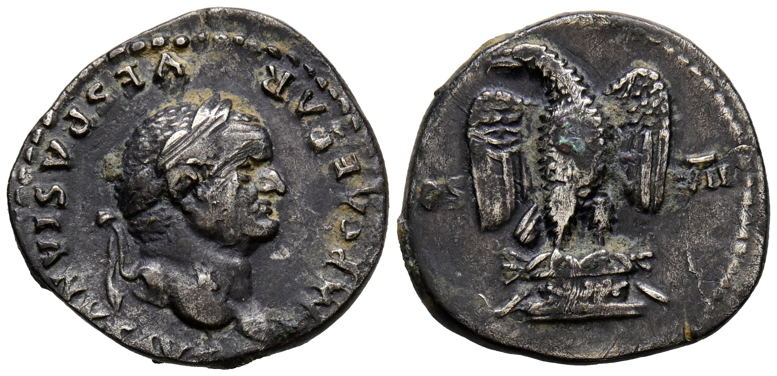 VESPASIANO. Denario. (Ar. 3,35g/18mm). 76 d.C. Roma. (RIC 848). Anv: Cabeza laureada de Vespasiano a izquierda, alrededor leyenda: IMP CAESAR VESPASIANVS AVG. Rev: Aguila estante a izquierda sobre altar, entre: COS-VII. MBC.