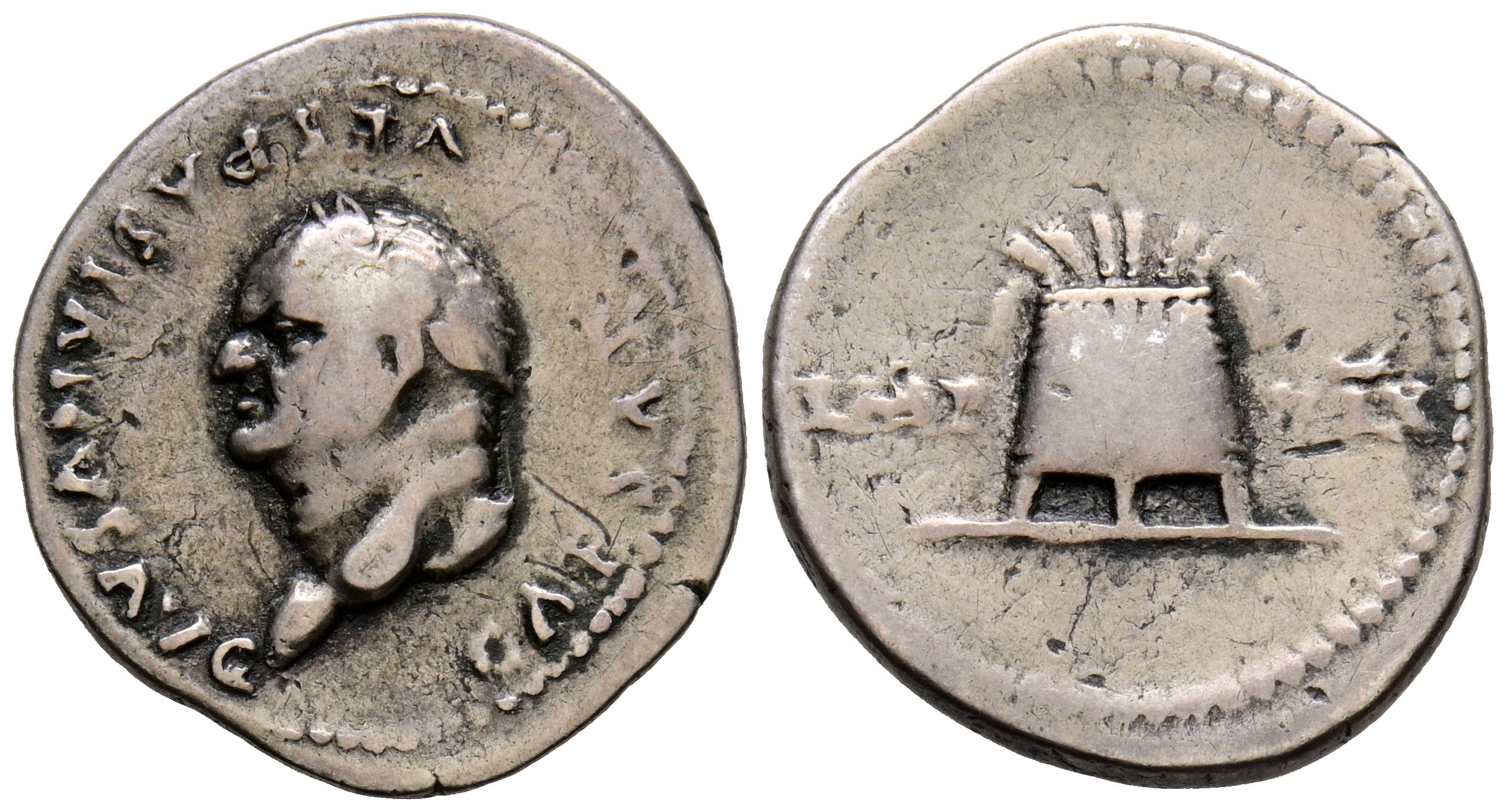 VESPASIANO. Denario. (Ar. 3,36g/20mm). 77-78 d.C. Roma. (RIC 981). Anv: Cabeza laureada de Vespasiano a izquierda, alrededor leyenda: CAESAR VESPASIANVS AVG. Rev: Modio, entre: IMP-XIX. BC+.