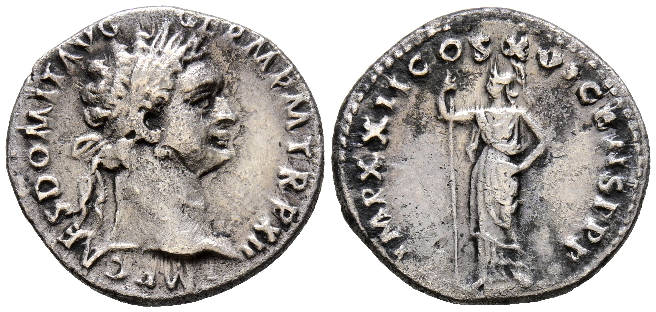 DOMICIANO. Denario. (Ar. 3,05g/19mm). 94 d.C. Roma. (RIC 764). Anv: Cabeza laureada de Domiciano a derecha, alrededor leyenda: IMP CAES DOMIT AVG GERM P M TR P XIII. Rev: Minerva estante a izquierda portando lanza, alrededor leyenda: IMP XXII COS XVI CENS P P P. MBC-.