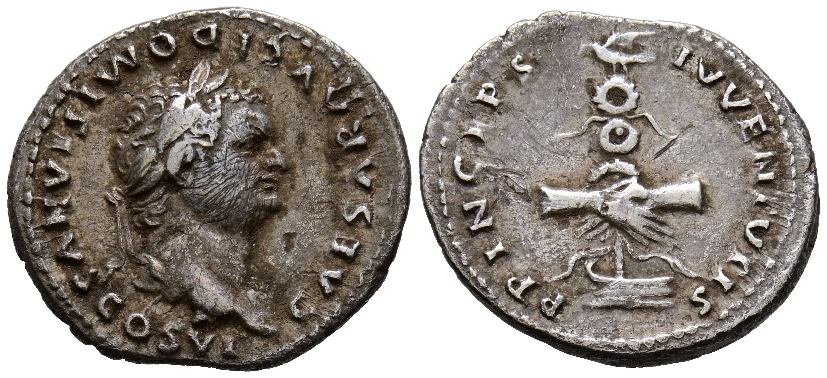 DOMICIANO. Denario. (Ar. 3,06g/20mm). 79 d.C. Roma. (RIC 1081). Anv: Cabeza laureada de Domiciano a derecha, alrededor leyenda: CAESAR AVG F DOMITIANVS COS V. Rev: Manos entrelazadas con aguila en estandarte sobre proa, alrededor leyenda: PRINCEPS IVVENTVTI. MBC.