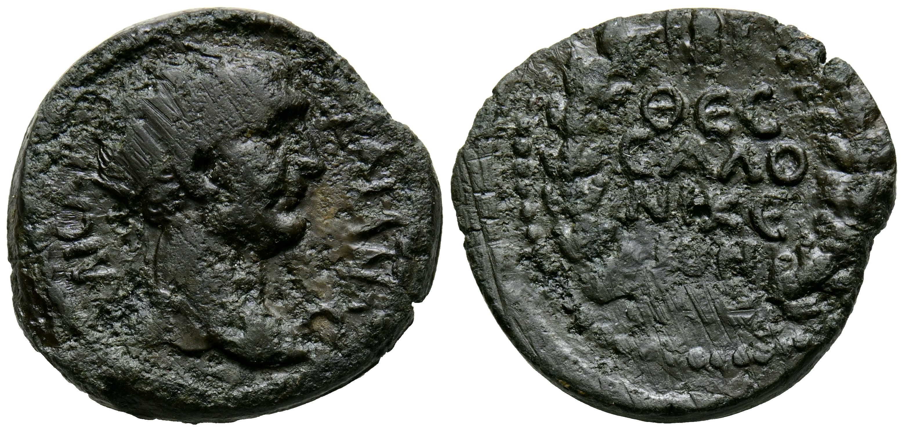 TRAJANO. Ae22. (Ae. 5,72g/22mm). 98-117 d.C. Tesalónica. (RPC 616). Anv. Cabeza radiada de Trajano a derecha, alrededor leyenda griega. Rev: Leyenda griega, dentro de corona de laurel. MBC.