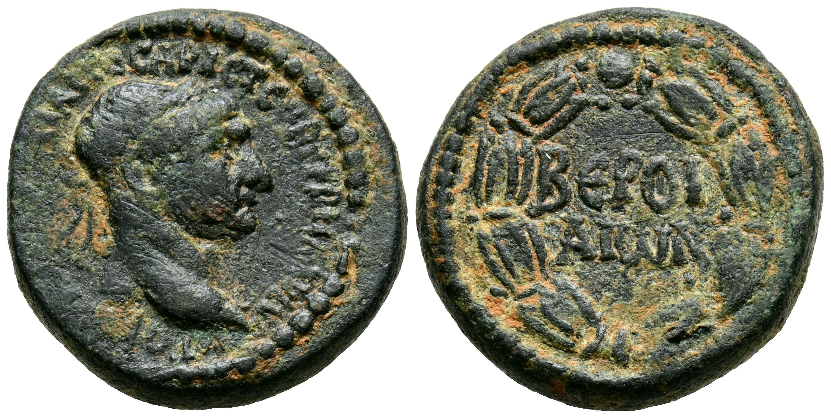 TRAJANO. Assarion. (Ae. 6,28g/19mm). 116-117 d.C. Siria, Beroia. (SNG Copenhagen 37; RPC 3427). Anv: Cabeza laureada de Trajano a derecha, alrededor leyenda. Rev: Leyenda en dos líneas dentro de corona de laurel. MBC.