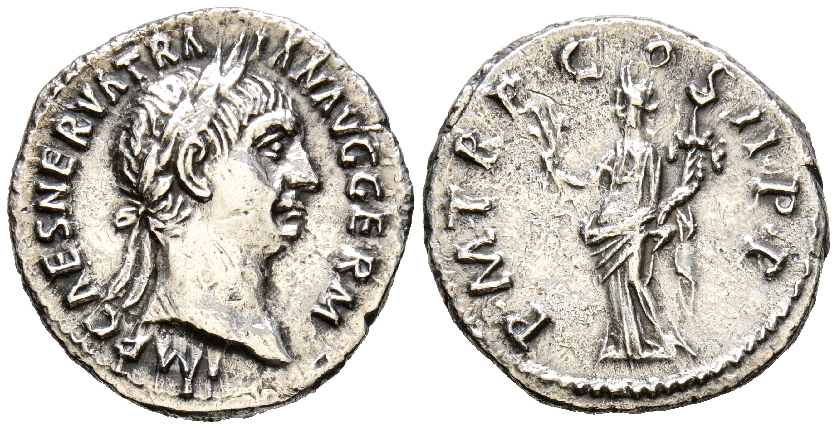 TRAJANO. Denario. (Ar. 3,17g/19mm). 98-99 d.C. Roma. (RIC 6). Anv: Cabeza laureada de Trajano a derecha, alrededor leyenda: IMP CAES NERVA TRAIAN AVG GERM. Rev: Felicitas estante a izquierda portando corona de laurel y cornucopia, alrededor leyenda: P M TR P COS II P P. MBC. Limpiado.