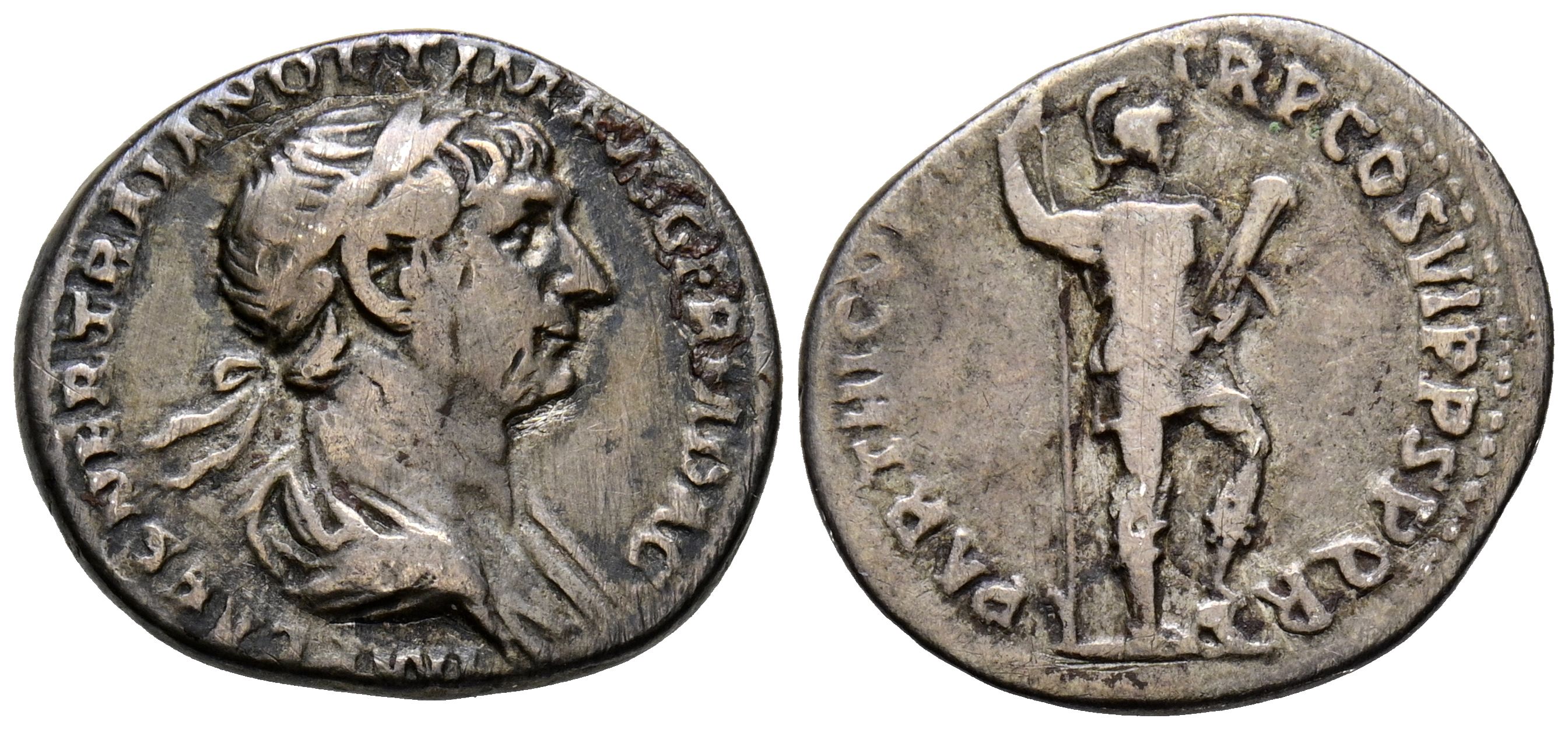 TRAJANO. Denario. (Ar. 3,15g/19mm). 116 d.C. Roma. (RIC 334). Anv: Busto laureado y drapeado de Trajano a derecha, alrededor leyenda: IMP CAES NER TRAIAN OPTIM AVG GER DAC. Rev: Virtus estante a derecha portando lanza y parazonium, pie izquierdo sobre casco, alrededor leyenda: PARTHICO P M TR P COS VI P P SPQR. MBC-.