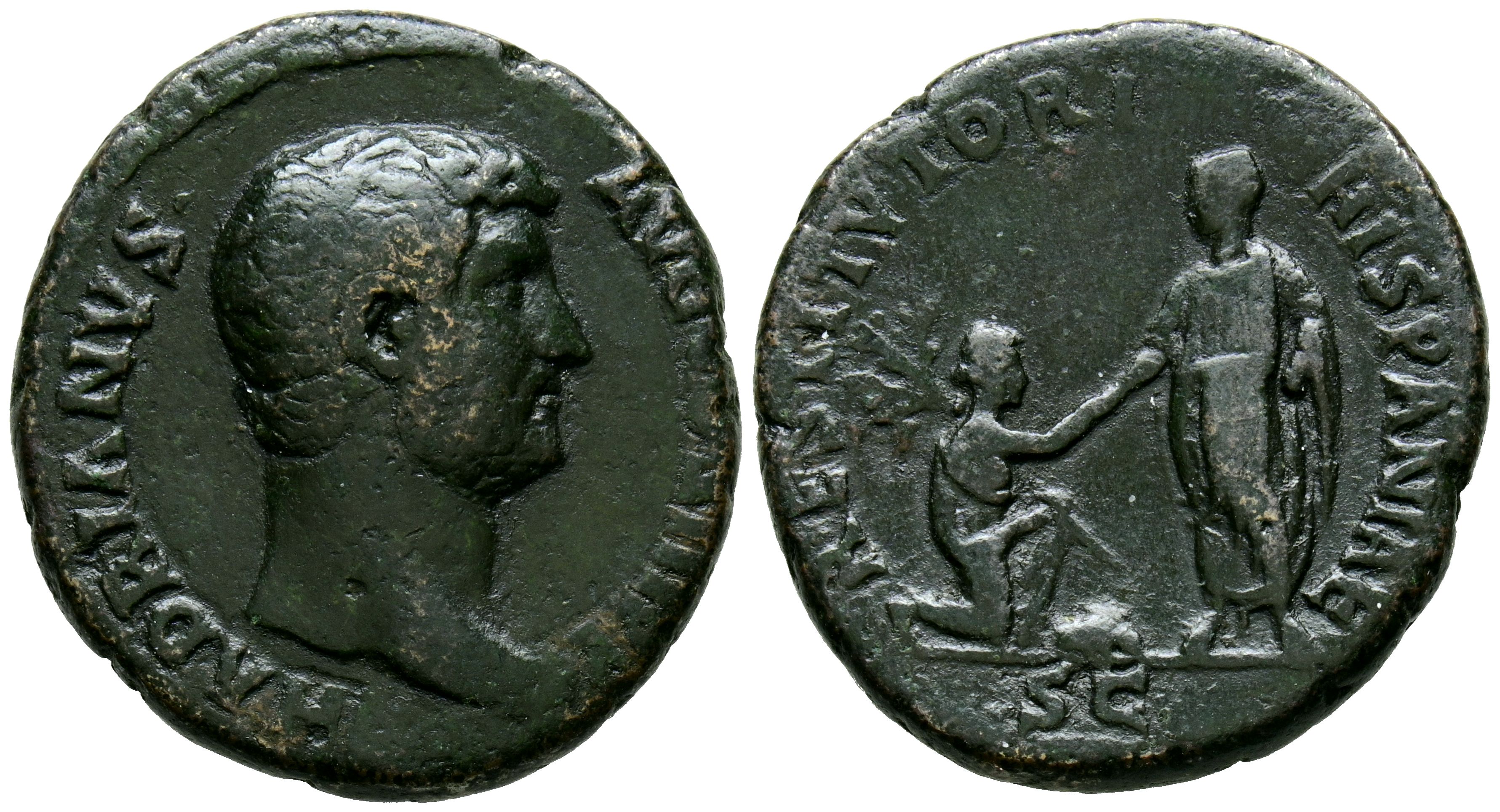 ADRIANO. As. (Ae. 10,73g/27mm). 134-138 d.C. Roma. (RIC 955a). Anv: Cabeza de Adriano a derecha, alrededor leyenda: HADRIANVS AVG COS III P P. Rev: Adriano estante a izquierda dando la mano a Hispania arrodillada a derecha, alrededor leyenda: RESTITVTORI HISPANIAE. MBC. Limpiado.